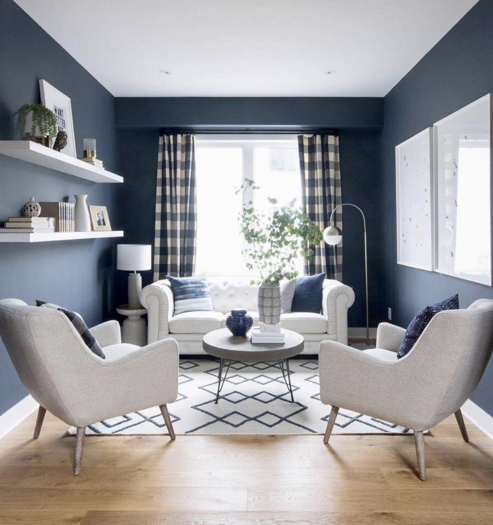 Here, dark navy walls create a striking stage for patterned curtains and crisp white furniture. It’s an inspired take on ideas with accent wall, showing how dark hues can work beautifully with contrasting pieces. Navy is a strong contender among living room paint colors 2026, bridging classic sophistication with contemporary edge. The design also leans into ideas sherwin palettes, proving that deep blue can feel both dramatic and inviting. Layering in grey flooring or wood tones can make this palette even more versatile, balancing the depth of color with warmth.