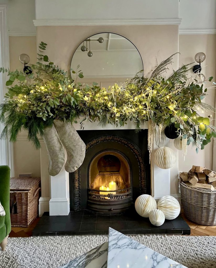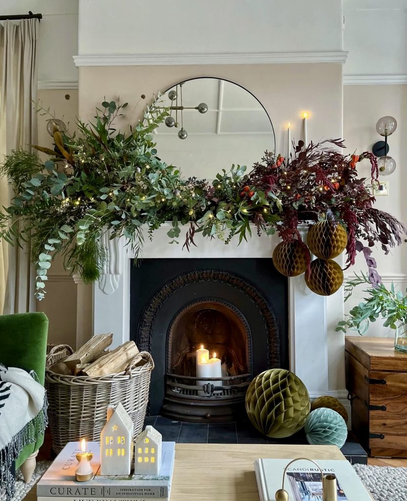 This mantle proves that a natural Christmas setup doesn’t have to be minimal. A dramatic garland of eucalyptus and winter foliage cascades across the fireplace, dotted with twinkling lights and taper candles that feel straight out of an elegant Christmas editorial spread. The addition of paper honeycomb ornaments brings a rustic texture, balancing the wild greenery with playful shapes. I love how the glowing candles inside the hearth echo the warmth above—it’s cozy without being overdone. A setup like this works beautifully for everyday winter decor and can easily be adapted for autumn with dried foliage or for Valentine’s Day with soft blush accents.