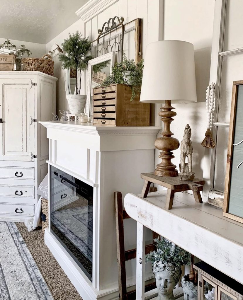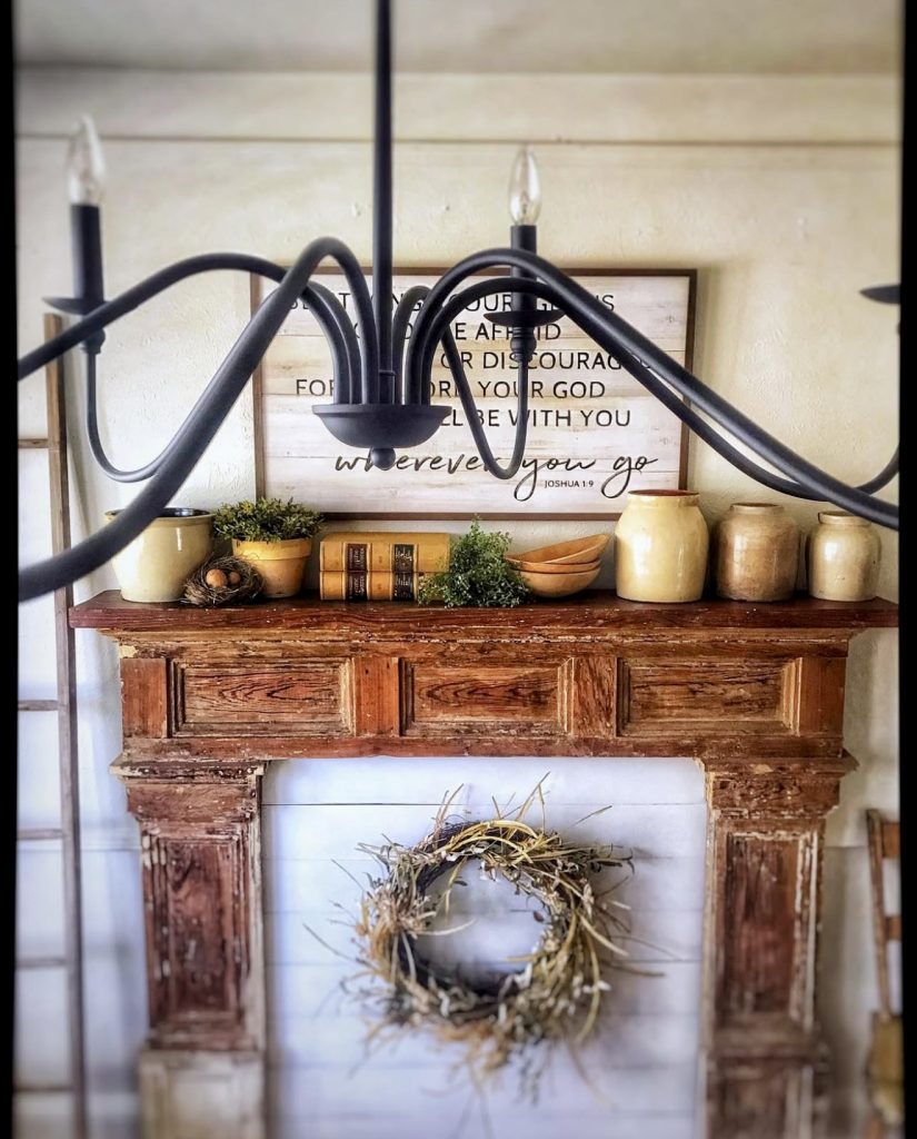 Few mantles capture the spirit of rustic design as beautifully as this one. A distressed wooden surround sets the tone, styled with simple pottery, greenery, and old books that give the arrangement an everyday charm. A twig wreath below ties the look together, grounding the mantle in natural textures. This isn’t about colorful Christmas sparkle or dramatic seasonal statements—it’s about embracing imperfection, history, and authenticity. For anyone who loves the rustic Christmas aesthetic, this mantle could easily adapt with a strand of greenery and warm candles while still staying true to its timeless farmhouse vibe.