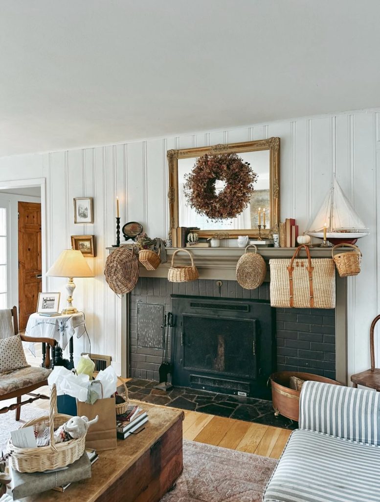This design instantly evokes a sense of coastal comfort, with its collection of woven baskets hanging from the mantle. Paired with a golden framed mirror and a dried floral wreath, the result feels both casual and personal. It’s proof that mantle styling doesn’t always have to be about greenery or garlands—sometimes it’s about texture and storytelling. Perfect for everyday decor, this setup can easily pivot into fall by adding pumpkins, or into colorful Christmas with ribbon-wrapped baskets. It’s a playful, layered look that feels like it belongs in a home filled with stories and character.