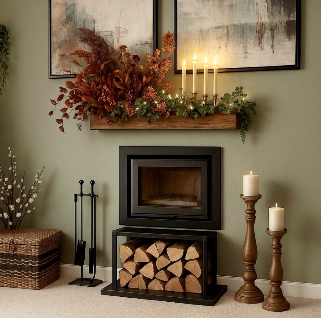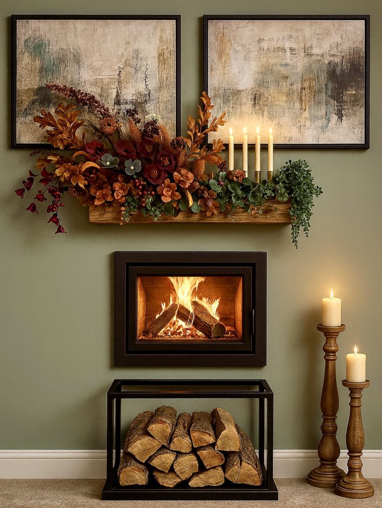 This mantle is all about modern fall impact. A burst of warm-toned florals in deep orange, crimson, and rust creates a bold statement that is instantly eye-catching. Nestled among the foliage, tall taper candles add a glowing elegance that elevates the design from cozy to chic. Paired with abstract artwork above, the overall look feels very contemporary, marrying rustic textures with modern art influences. It’s a fantastic choice for those who want their mantle to take center stage during autumn and easily transition toward a festive Halloween look with just a few darker accents.