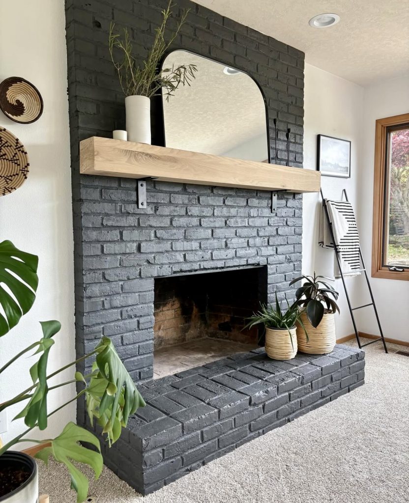 Sometimes the architecture does all the talking. This black-painted brick fireplace already feels large and commanding, so the mantle decor stays minimal. A pale wood beam mantle, a curved mirror, and simple potted plants make the design feel clean and contemporary. This is a mantle that could handle any season with ease: fresh greenery for Christmas, dried grasses for fall, or even seashells for a subtle coastal nod. Its strength lies in restraint, proving that sometimes less is more when the materials themselves create drama.
