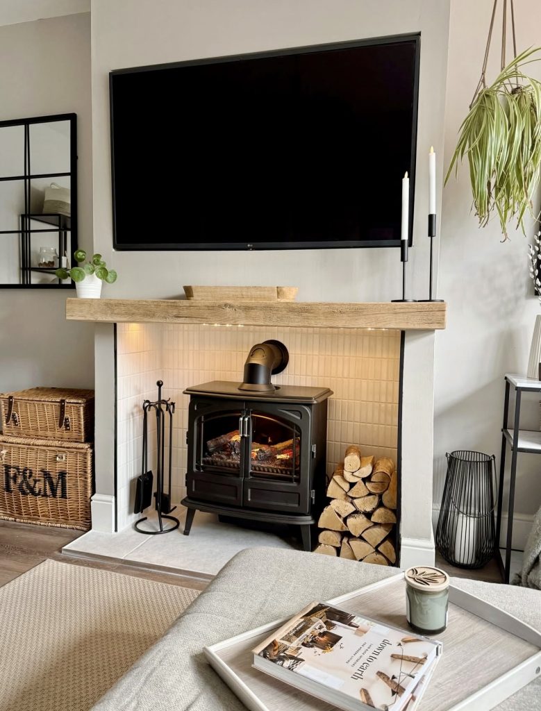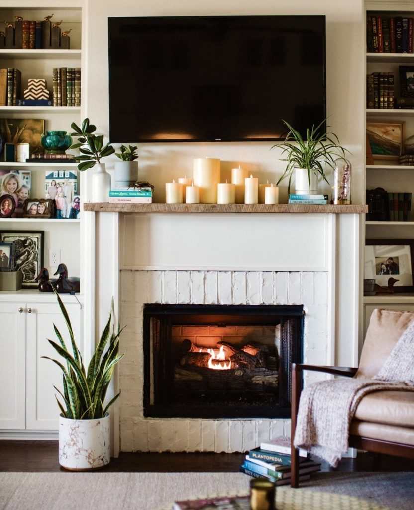 This setup blends practicality with understated elegance. A sleek TV hangs above the fireplace, while the mantle is kept minimal with just two slim candles and a potted plant. The natural wood beam adds warmth to the clean design, proving that you don’t need excessive decoration for impact. This look fits perfectly in a contemporary home where the mantle is more about balance than ornamentation. For the holidays, you could easily layer in garlands for modern Christmas or pumpkins for fall, while still keeping the space uncluttered.