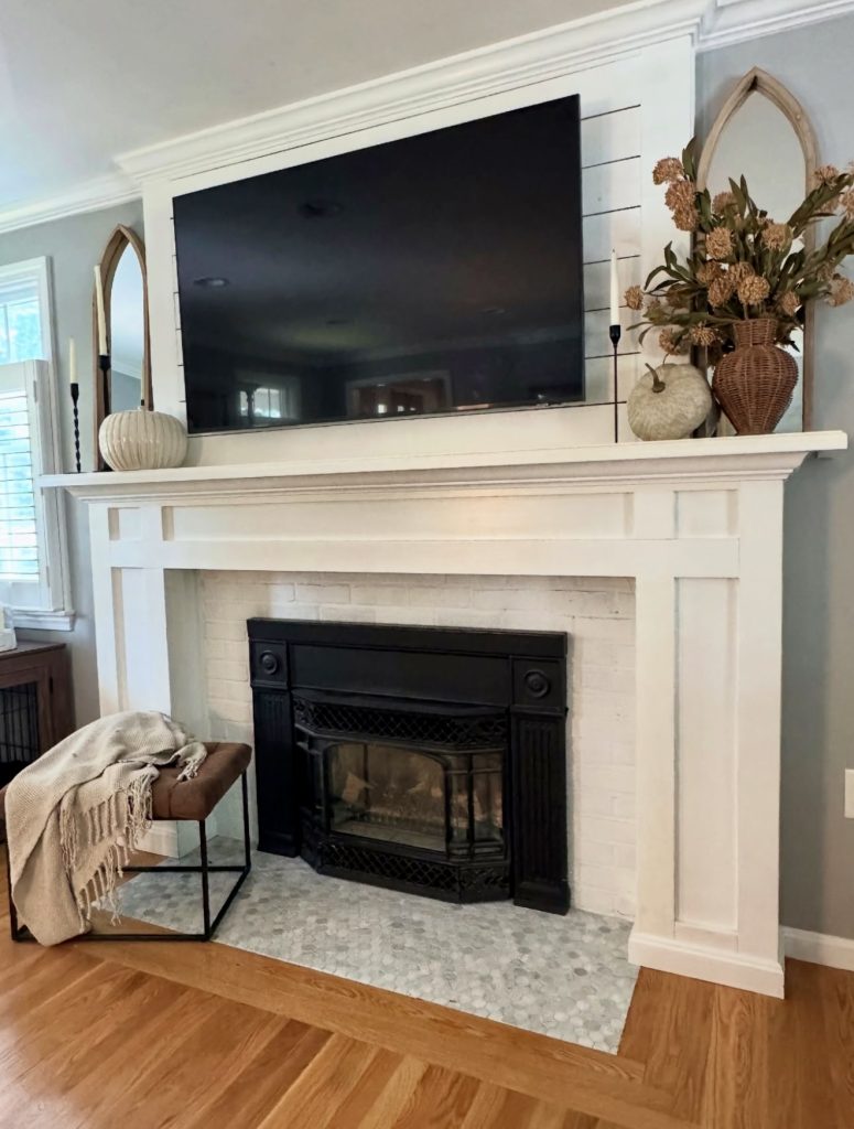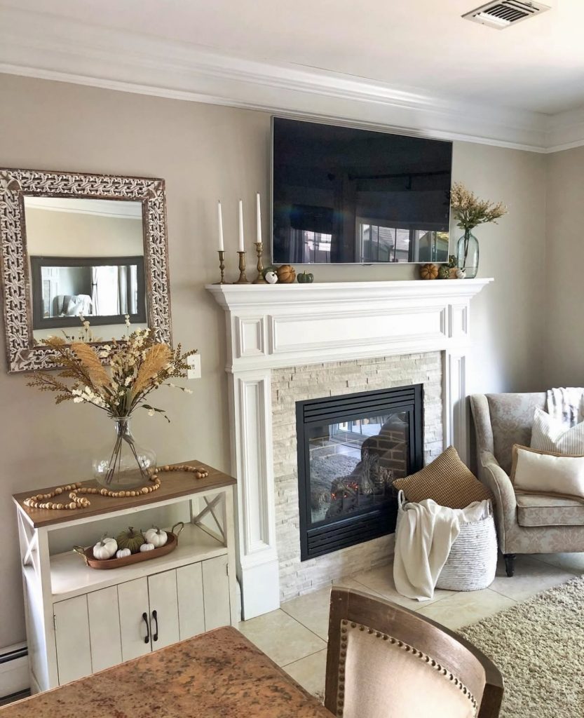 This mantle embraces autumn with understated elegance. Slim brass candlesticks, a simple vase of dried grasses, and a few small pumpkins make the space feel cozy and seasonal without overwhelming the room. The TV above adds a modern layer, making the design practical for daily life. The key takeaway here is how easily this mantle could pivot between seasons: swap the pumpkins for greenery to move into traditional Christmas, or add hearts and candles for Valentine décor.