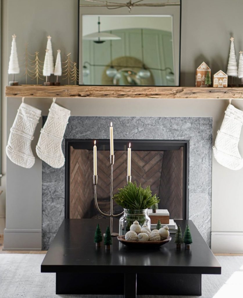 This mantle captures the spirit of a modern Christmas with a neutral Christmas palette. White knitted stockings hang from a rustic wooden beam, while miniature trees and gingerbread houses add just enough festivity without overwhelming the space. The symmetry and muted tones create a calm, polished look that feels both elegant and family-friendly. This style is proof that you don’t need bold color to make a mantle festive—sometimes, simplicity feels the most magical.