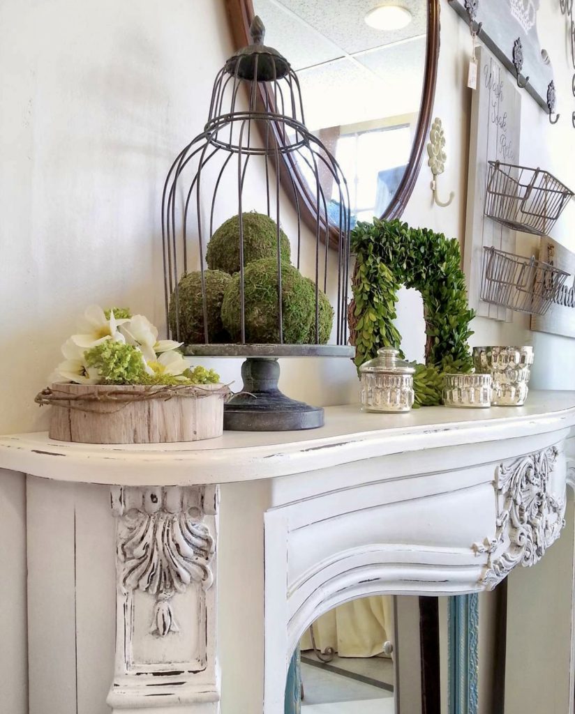 For those who love a vintage fall or shabby-chic aesthetic, this mantle speaks volumes. An ornate carved surround is paired with natural greenery and moss balls, creating an everyday look that can easily transition between seasons. Mercury glass votives add a bit of sparkle, while the overall design feels rooted in traditional elegance. This is the kind of mantle you’d expect to see in a boutique bed-and-breakfast, where every piece tells a story.