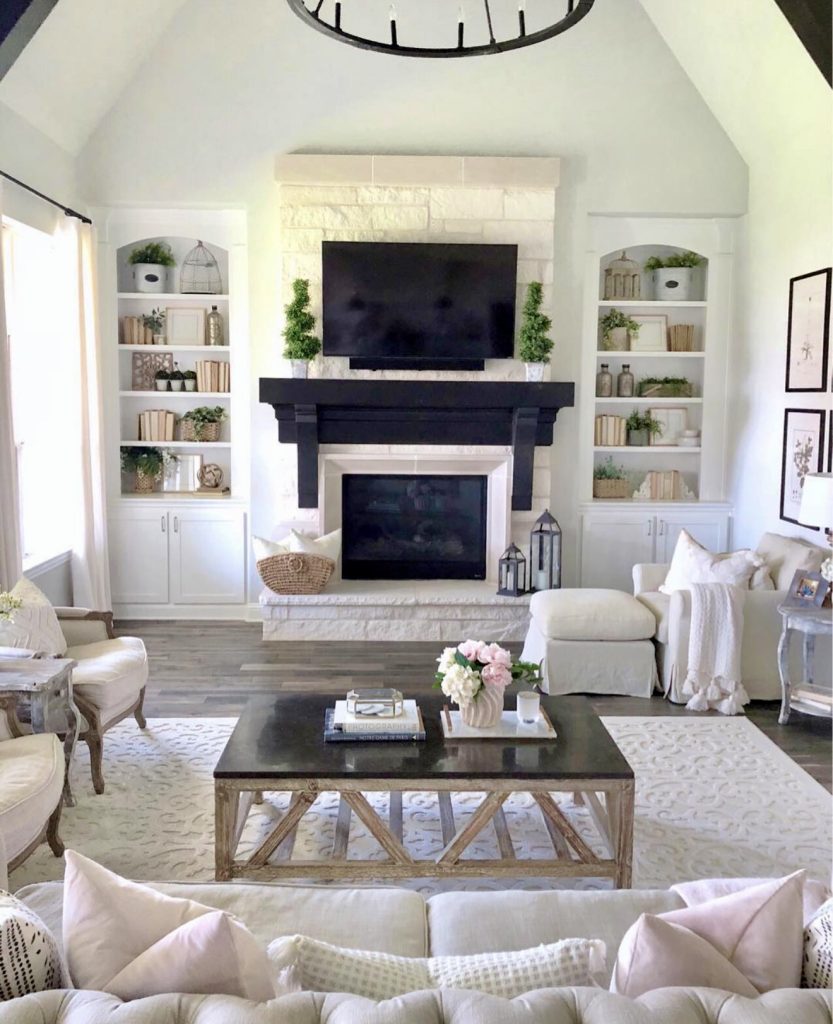 Here, the mantle becomes a large architectural feature in the living room, framing the TV while anchoring the entire space. Flanked by built-in shelves styled with greenery and neutral accents, the black-and-white fireplace feels both contemporary and welcoming. This design works beautifully for families who want an everyday setup that looks pulled together without needing constant seasonal refreshes. During Christmas, a bold garland could be draped across the mantle for instant festivity.