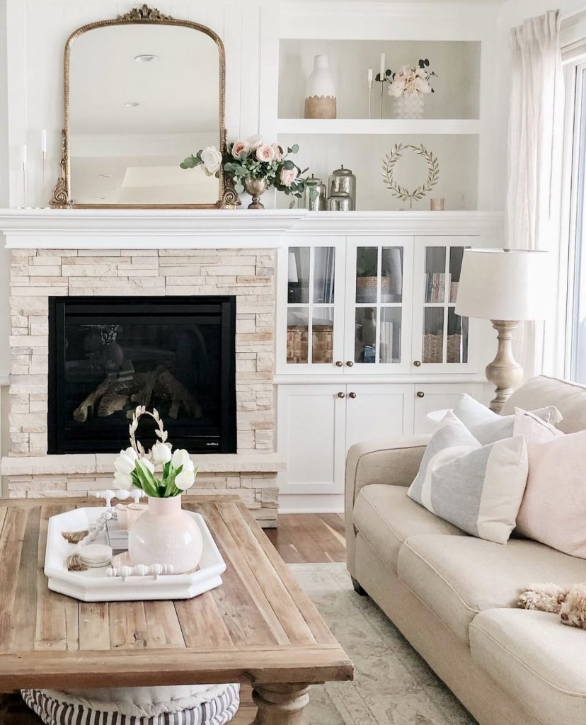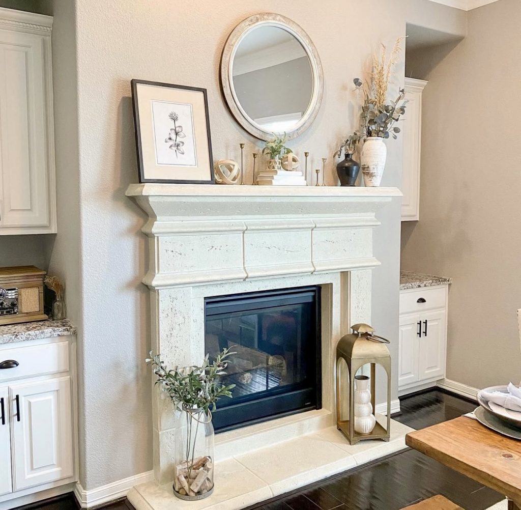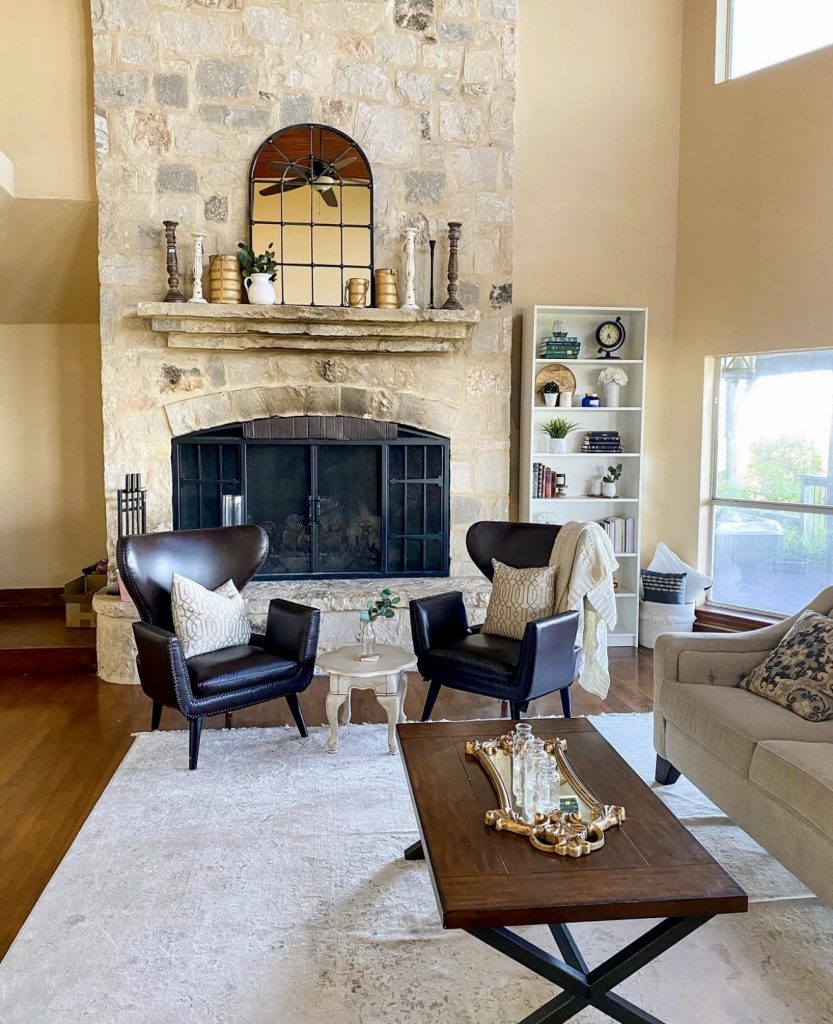 Nothing says rustic quite like a stone fireplace, and this mantle makes the most of its natural charm. The stone surround feels bold and traditional, while a simple arrangement of candlesticks and metallic accents keeps the decor grounded. The arched mirror reflects light beautifully, giving the room a sense of openness. This is a mantle that could handle any seasonal change with grace—garlands for rustic Christmas, gourds for fall, or lanterns for a coastal summer touch. It’s versatile, enduring, and deeply inviting.