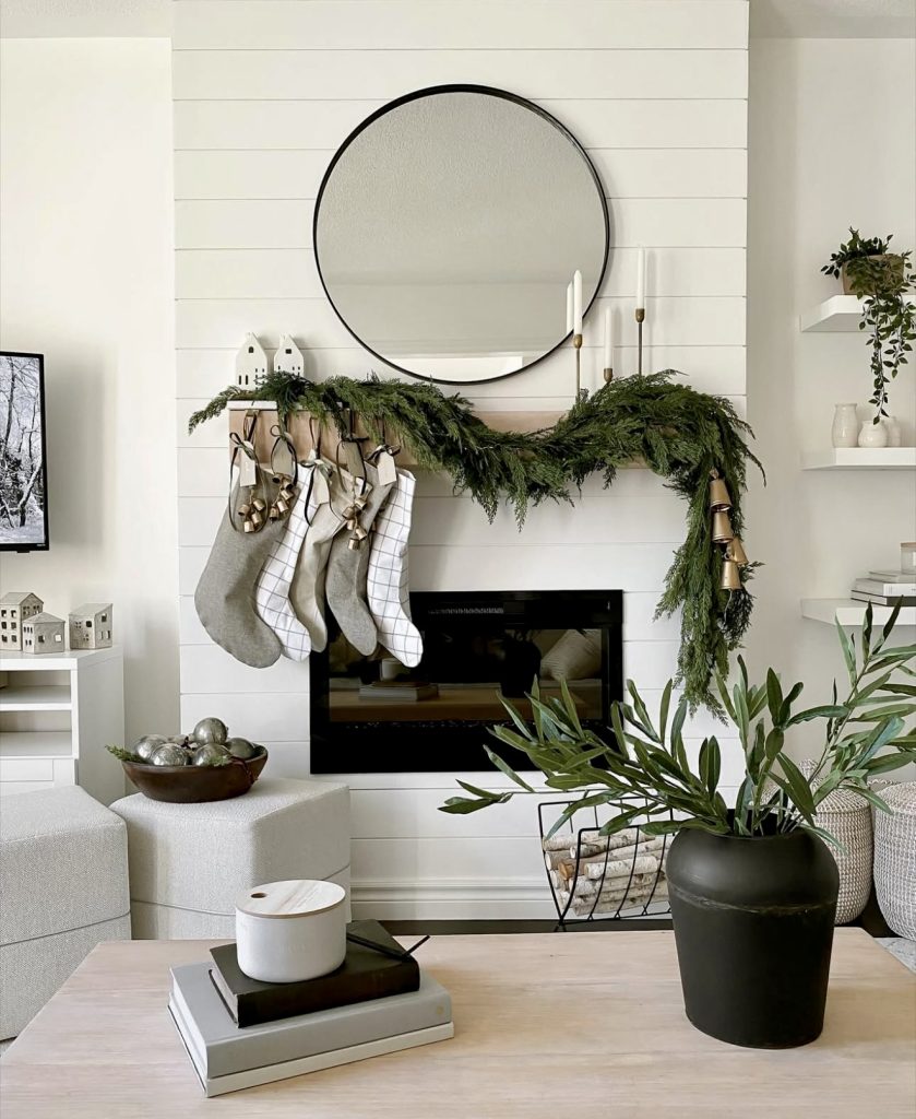 This mantle is the epitome of traditional Christmas charm. A lush garland drapes naturally across the beam, accented with gold bells and stockings that feel timeless yet stylish. The round mirror above balances the vertical lines of the shiplap wall, while minimalist houses and tall candlesticks add a modern Christmas touch. This design proves how mixing classic elements with contemporary accents creates a mantle that feels both nostalgic and fresh.