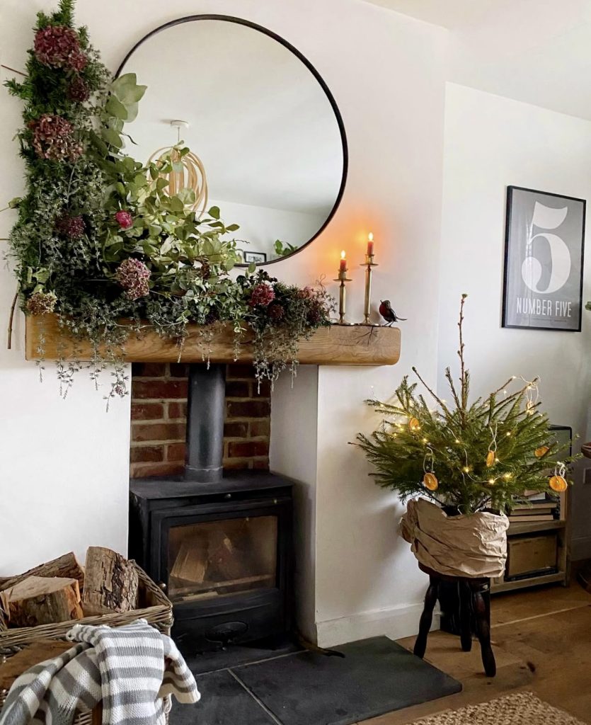 For those who love a statement, this mantle embraces natural Christmas style with an asymmetrical garland that cascades down one side. Hydrangeas and textured greenery add depth, while slim brass candlesticks give height and elegance. The small tree decorated with dried orange slices completes the look, bringing in a hint of rustic Christmas tradition. This design feels fresh, editorial, and perfect for homeowners who want a mantle that wows without relying on symmetry.