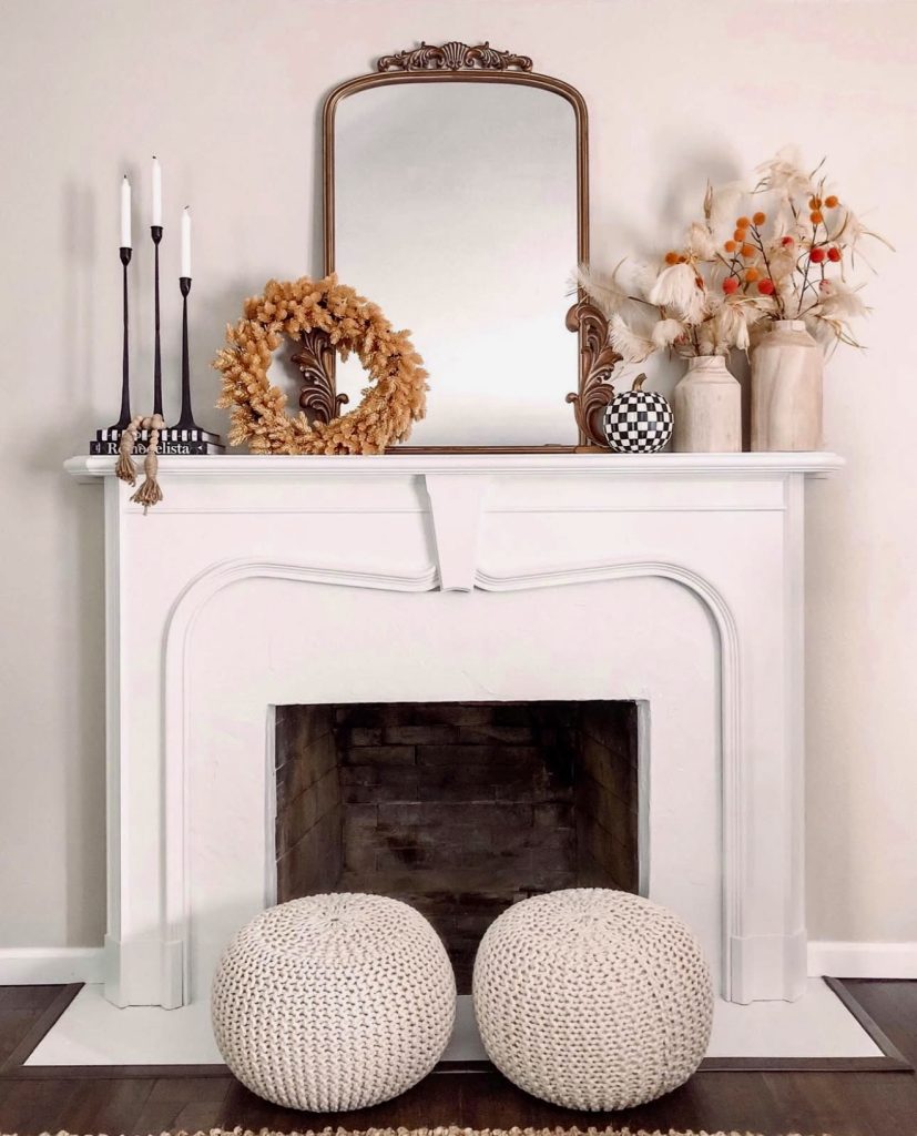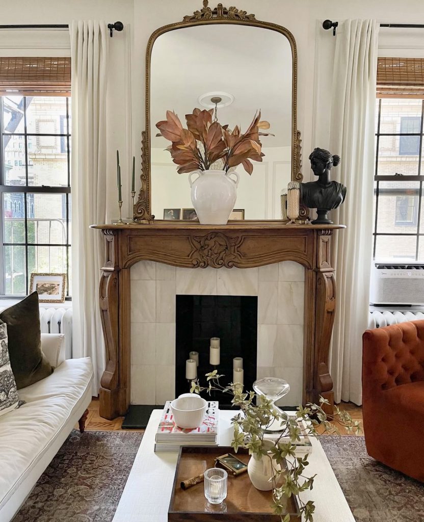Sometimes a mantle speaks for itself. This traditional carved wood fireplace becomes the star, paired with a gilded mirror that adds height and drama. The styling leans toward vintage fall with a simple vase of magnolia leaves, earthy in tone but rich in texture. On one side, a black bust sculpture grounds the look, while slender candles add subtle glow. This is a reminder that mantle decor doesn’t always have to scream “holiday”—sometimes it’s about layering meaningful objects that tell your story. A setup like this feels timeless, perfect for everyday elegance that can easily shift toward modern Christmas with just a few added ornaments.