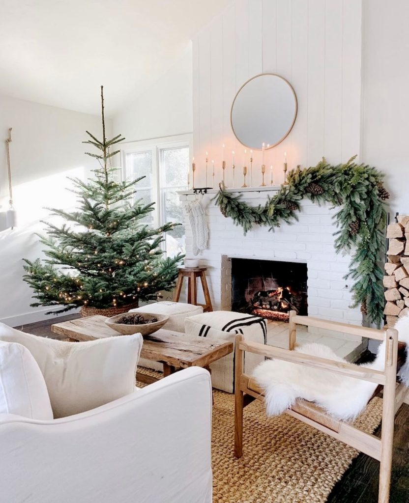 Simplicity can be just as powerful as maximalism. Here, a white painted brick fireplace is draped with an evergreen garland accented by pinecones, styled in a way that captures the essence of a modern Christmas. Slim brass candlesticks line the mantle, giving height and glow without overwhelming the space. The raw wood coffee table and layered textures bring a distinctly rustic but elevated tone—perfect for fans of Scandinavian style. While the decorated tree nods to the holidays, the mantle itself could just as easily serve as a modern fall focal point with dried grasses or a Halloween twist with dark candles and gourds.