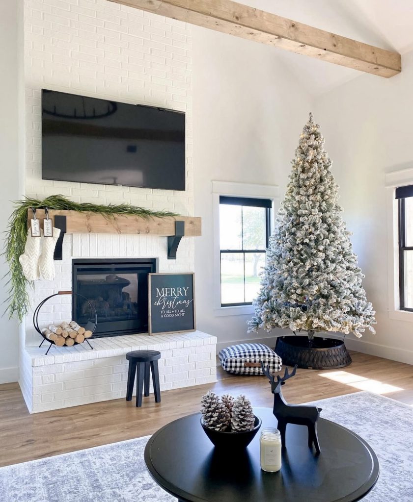 Many homeowners face the challenge of decorating a mantle when a TV hangs above it. This design shows exactly how to balance function and beauty. The wood beam mantle adds rustic charm against the white brick, while a slim garland and stockings bring in the modern Christmas spirit without overwhelming the space. The flocked tree next to the fireplace doubles the holiday impact, making the room feel cheerful and balanced. The takeaway here: less is more when the TV is part of the focal point, and greenery is always a safe bet for keeping the look festive but not fussy.
