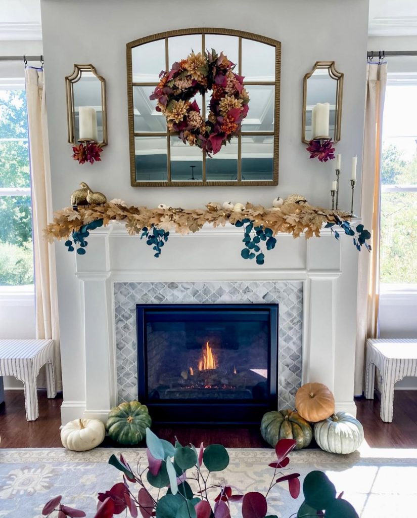 This mantle embraces modern fall decorating at its best. A layered garland of golden leaves and eucalyptus is paired with a bold floral wreath in rich jewel tones, making the fireplace a true focal point. Pumpkins of different shades—sage green, ivory, and amber—rest at the base, offering that classic autumn harvest touch. This design feels festive without being cliché, and it could transition seamlessly into Thanksgiving. For homeowners wanting a look that feels celebratory yet polished, this is a great blueprint for keeping the mantle seasonal and elegant.