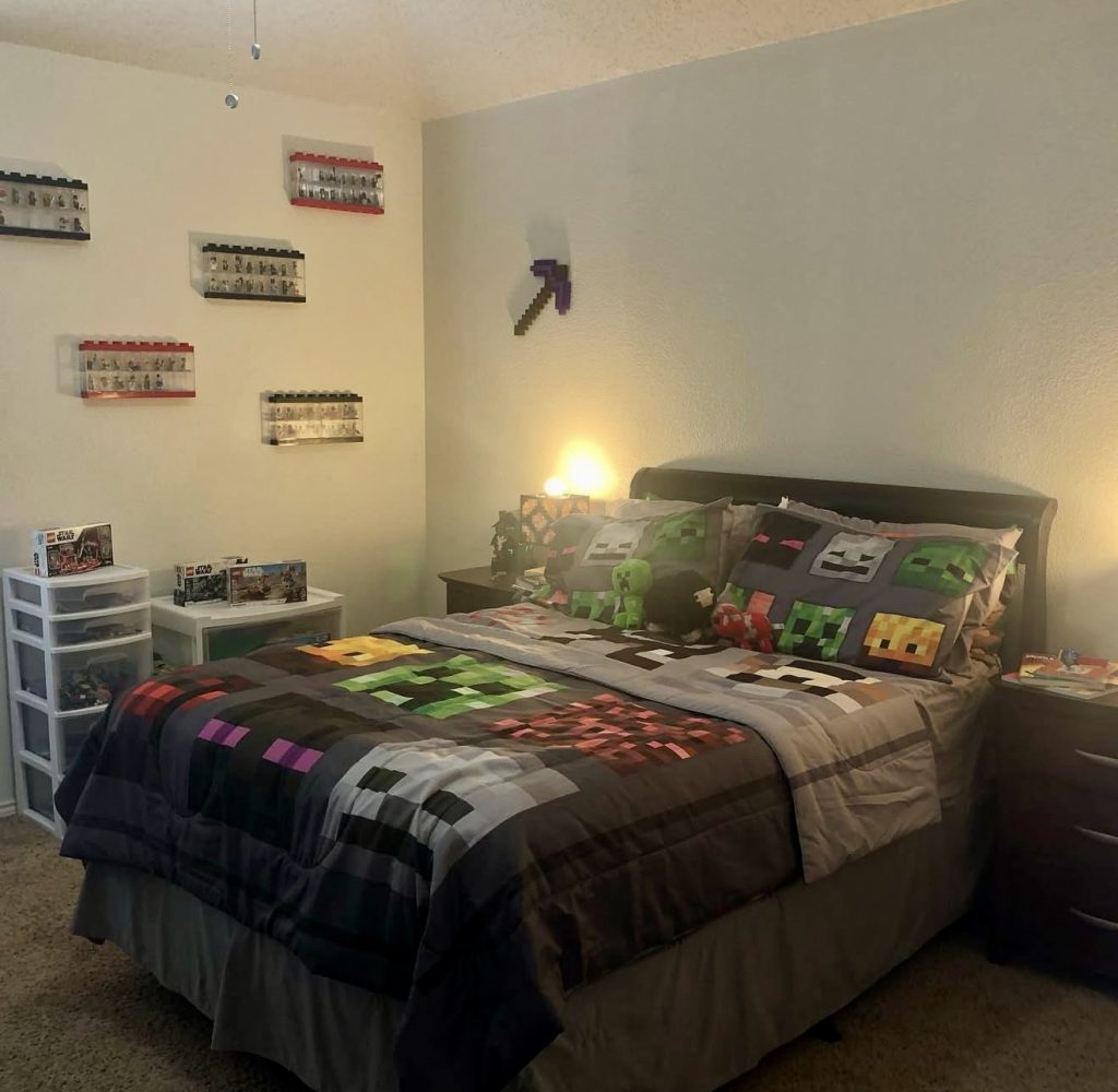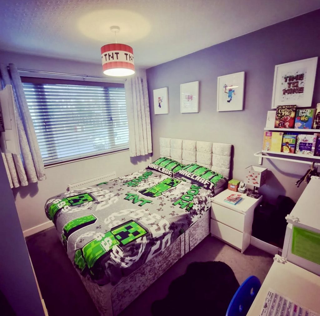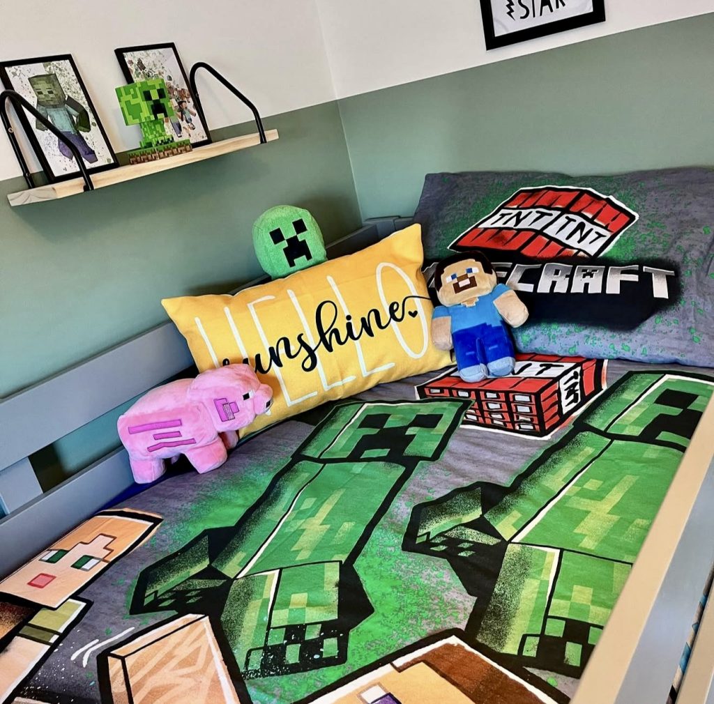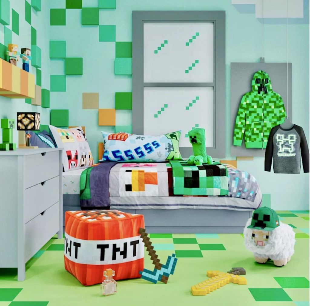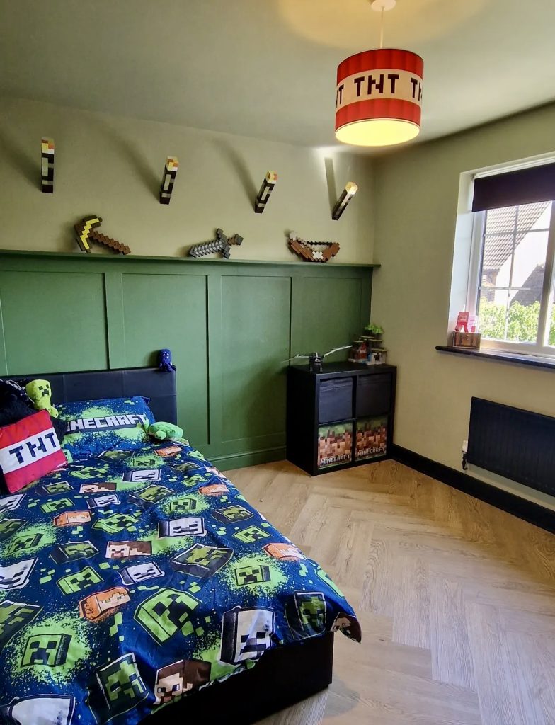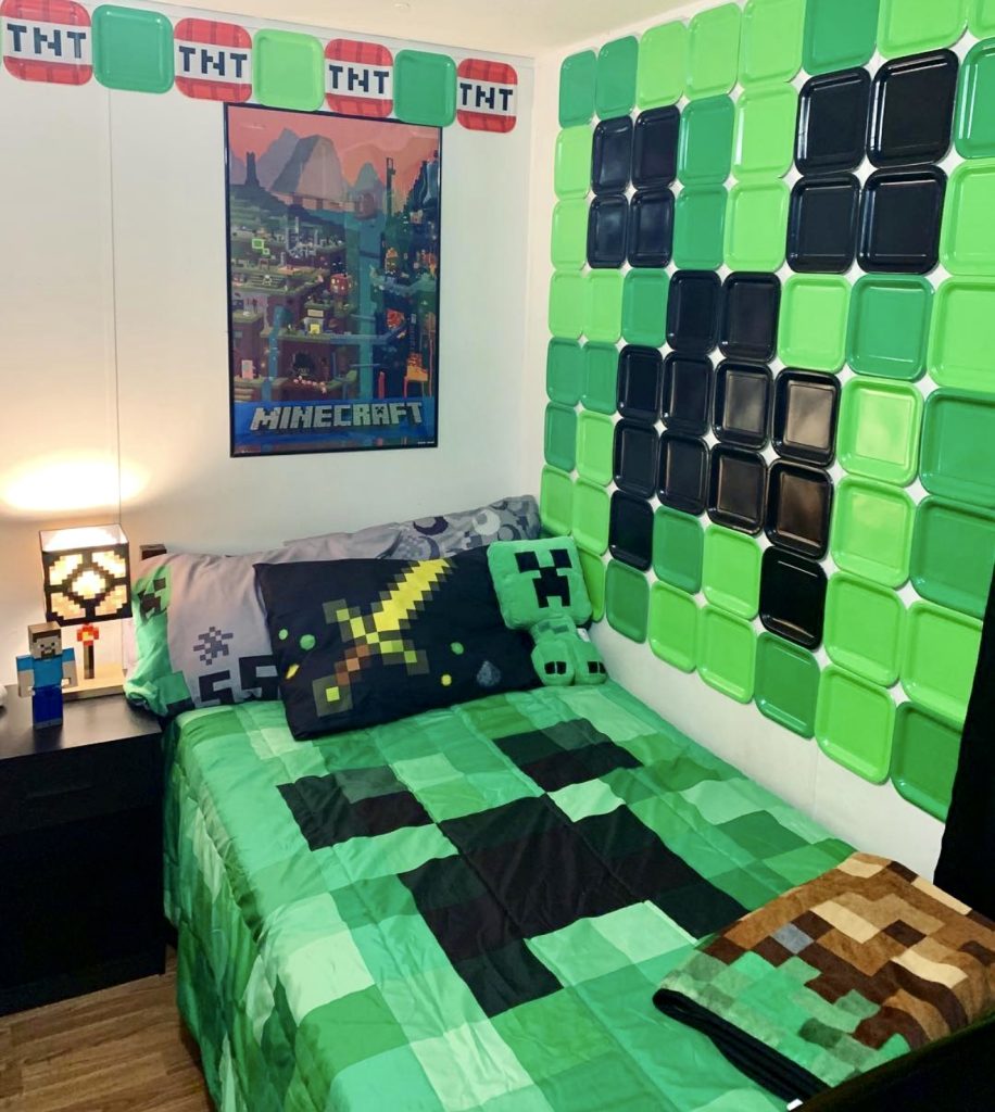This room demonstrates how Minecraft-inspired décor can blend seamlessly into a more mature palette—ideal for families who prefer a softened, modern take. The muted walls and tufted headboard make the space calming and adult-friendly, while the Creeper bedding and TNT lampshade introduce just enough game charm to keep things playful. It’s a perfect illustration of minimal yet meaningful themed décor, the kind of look lifestyle editors at Domino often recommend for transitional spaces. Everything feels intentional, cozy, and grounded in real life, with the Minecraft elements acting as tasteful accents instead of overwhelming statements.