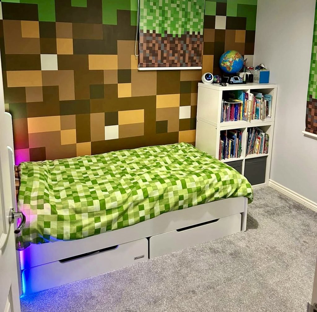 This bold, dark backdrop offers a fresh take on Minecraft design, leaning into a nighttime aesthetic that feels dramatic and personal. The pixel-style lettering brings that unmistakable vanilla block identity, while the clean white bed frame keeps the look balanced and modern. This is the sort of high-contrast environment décor editors at Domino highlight when discussing how to make a kid’s room feel “grown but still magical.” It’s also a great example of how simple elements—pixel art, themed bedding, a few wall props—can completely transform a space without requiring any mods or complex installations.