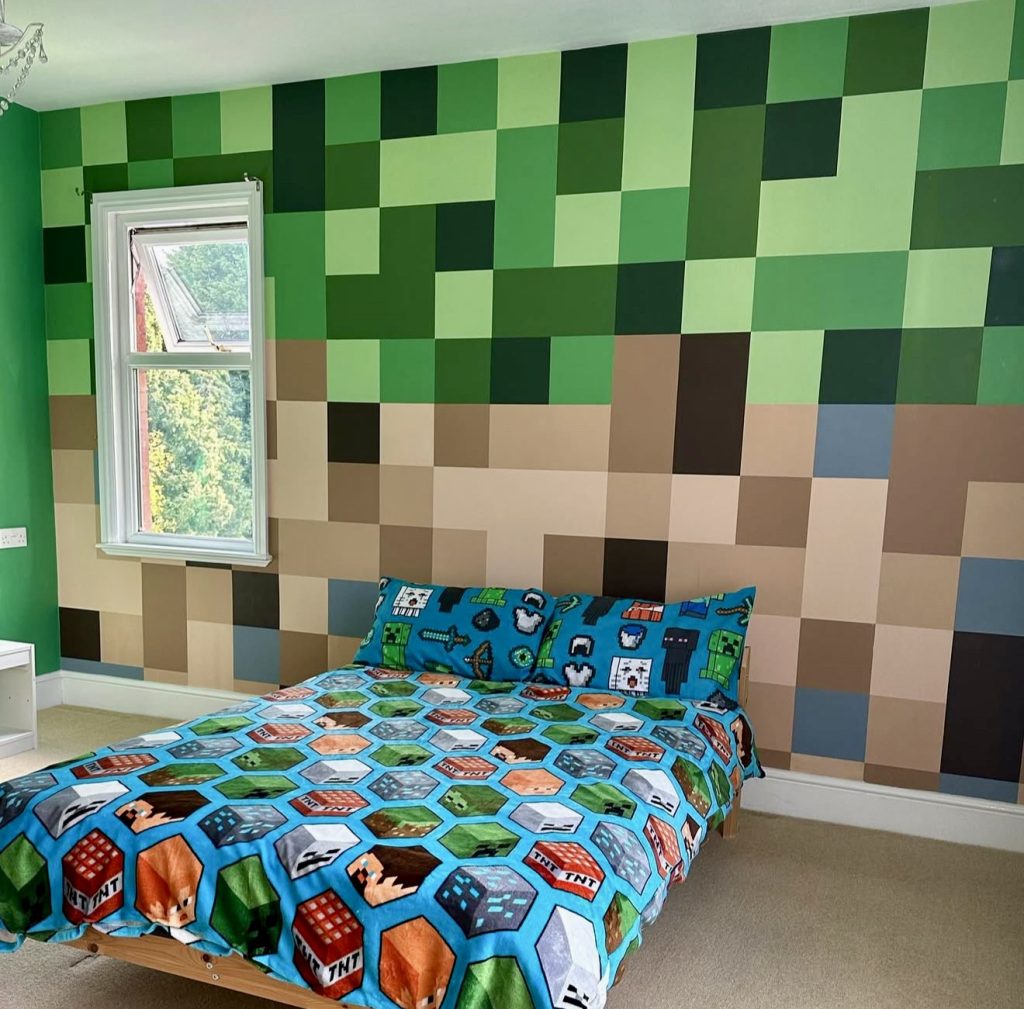 This oversized pixel mural takes direct inspiration from grassy terrain in the game, creating a backdrop that instantly transports you into a familiar biome. What makes this idea feel so effective in real life is how the painterly precision captures the softness of light and shadow seen in vanilla blocks—something interior stylists often describe as “immersive minimalism.” The clean, borderless design keeps the wall from feeling busy, while the vibrant bedding adds a touch of cute storytelling without overwhelming the room. It’s a fantastic option for families wanting something simple and visually striking without committing to heavy furniture changes or complex mods.