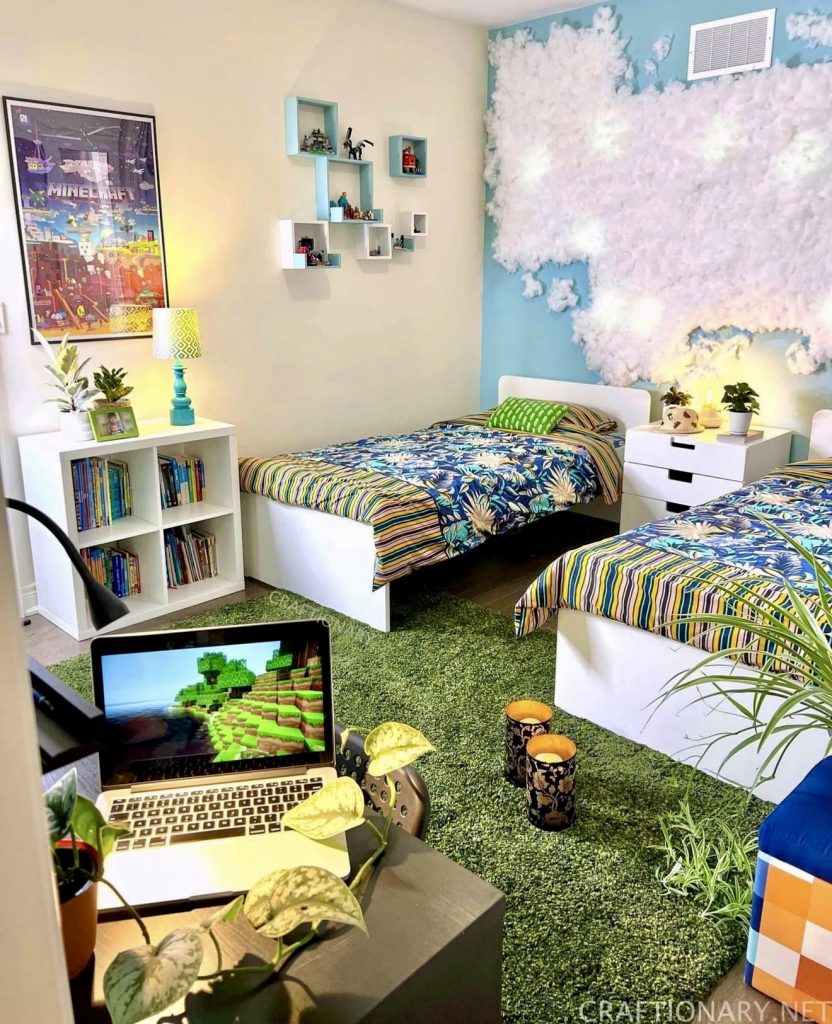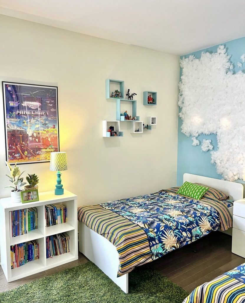 This idea returns to that refreshing sky-inspired palette, where soft blues and textured white clouds create the illusion of floating above a biome in the game. The design blends whimsical elements with functional layout choices, creating a space that feels both cozy and clean. The asymmetrical shelving adds a structured game aesthetic without being overly literal, while the rug brings in gentle grassy tones that subtly nod to overworld landscapes. It’s an excellent example of simple but thoughtful design—something magazines like Better Homes & Gardens frequently praise for kids’ spaces that balance imagination with everyday comfort.