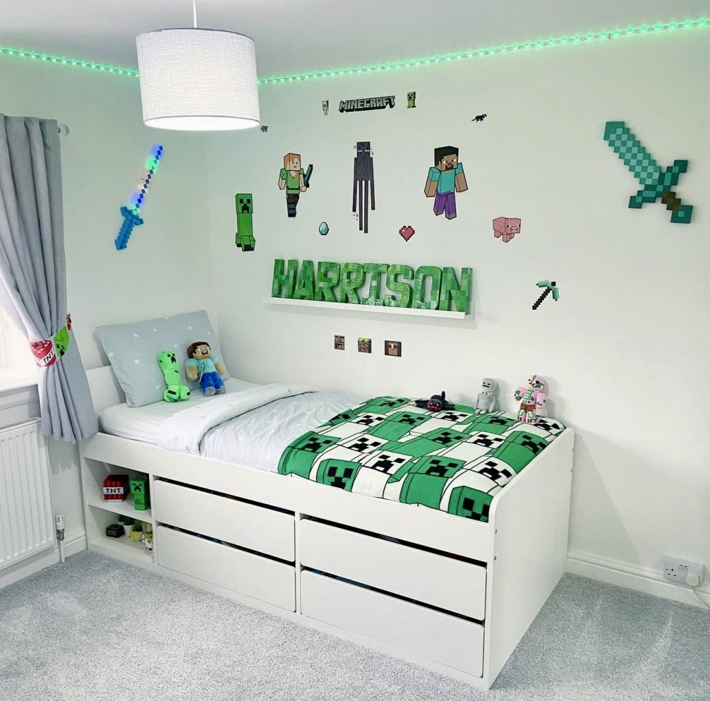 This setup uses restraint to create a crisp and modern Minecraft-inspired room. The white backdrop lets the bright character graphics shine without feeling cluttered, a technique often recommended by decor editors at Real Simple when balancing bold themes with clean design. The personalized name shelf adds a warm, cute touch while keeping everything tidy and easy to manage. The LED strip casting a gentle green glow along the ceiling introduces that unmistakable game aesthetic without leaning into anything too dark. It’s a smart option for parents who want a space that grows gracefully while still honoring their kids’ love of the game.