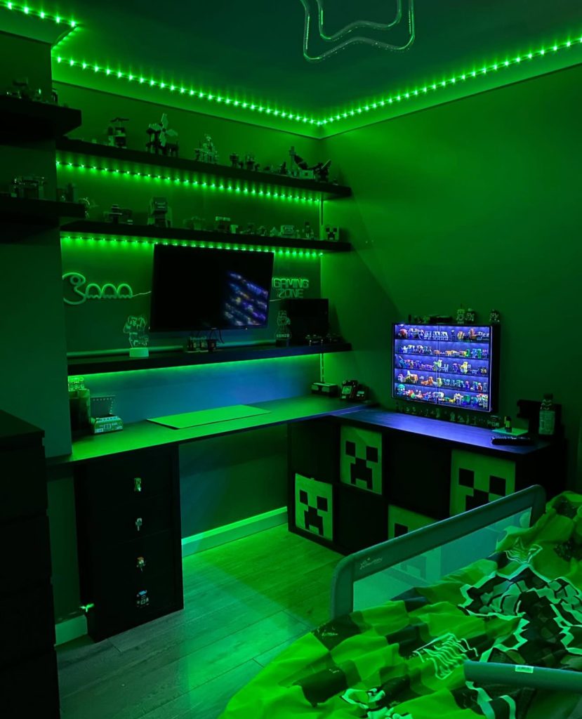 This room leans fully into a futuristic, dark, glowing ambiance, much like entering a mysterious forest base in a game. The LED lighting wraps the room in a neon green atmosphere, creating an instant sense of immersion without requiring elaborate constructions or mods. The sleek desk setup and floating shelves give the space a modern, almost professional gaming feel—something teens and adults alike appreciate. It echoes ideas promoted by gaming-focused designers at PC Gamer Interiors, who often highlight how lighting can transform even a simple room into a fully realized gaming sanctuary. This is an ideal look for fans who want high-impact design while keeping furniture practical.