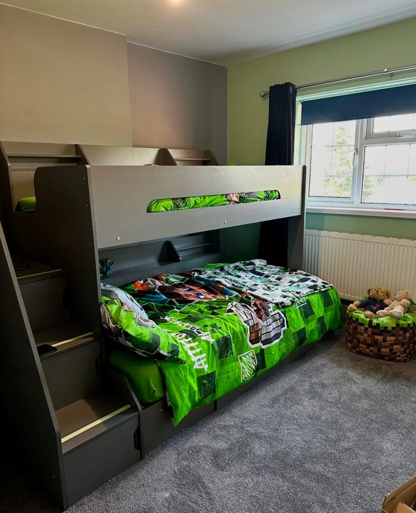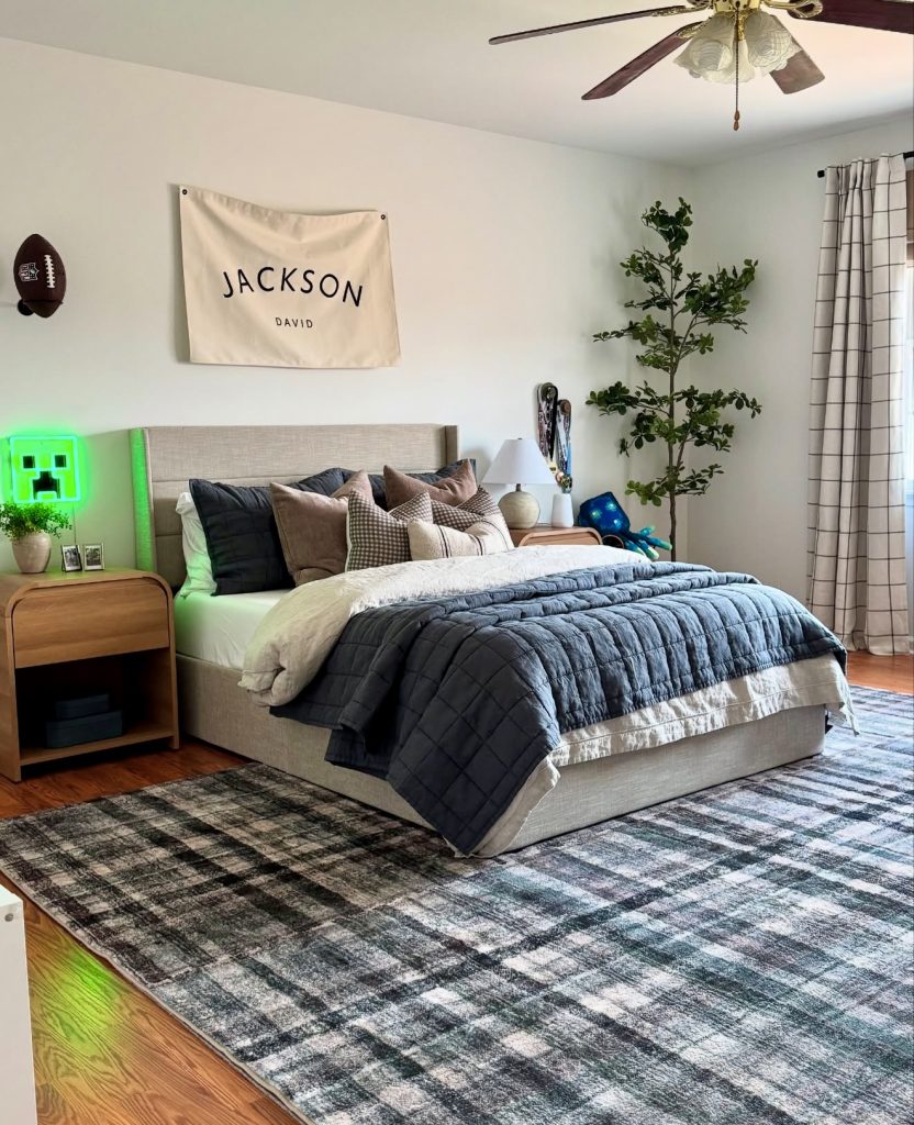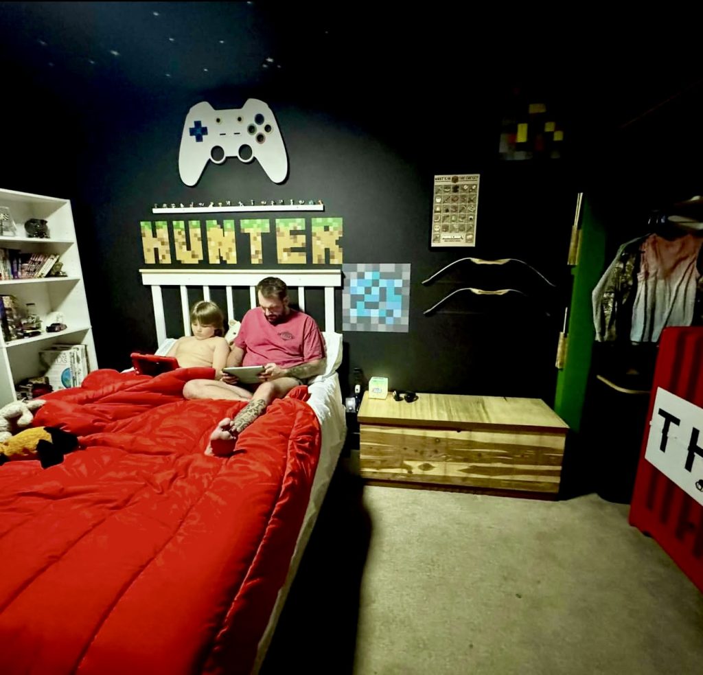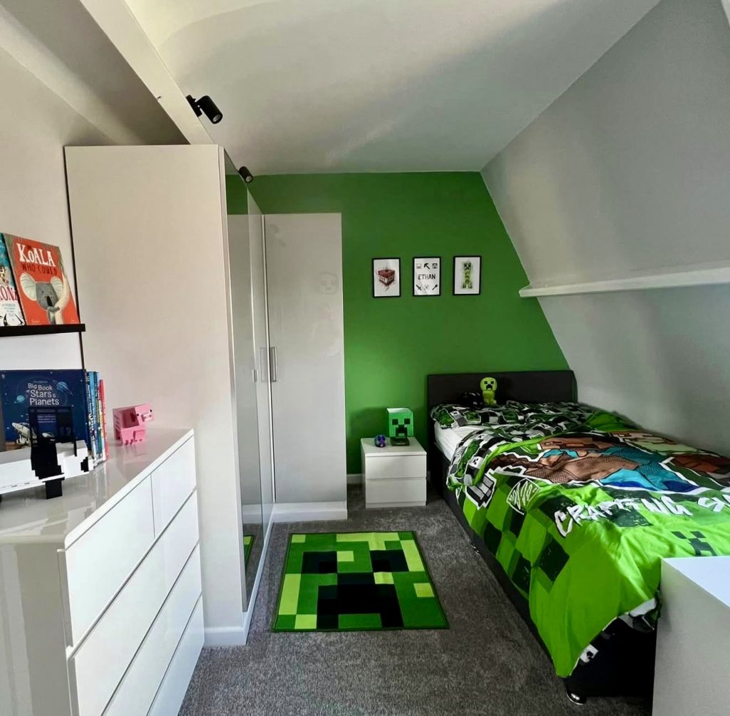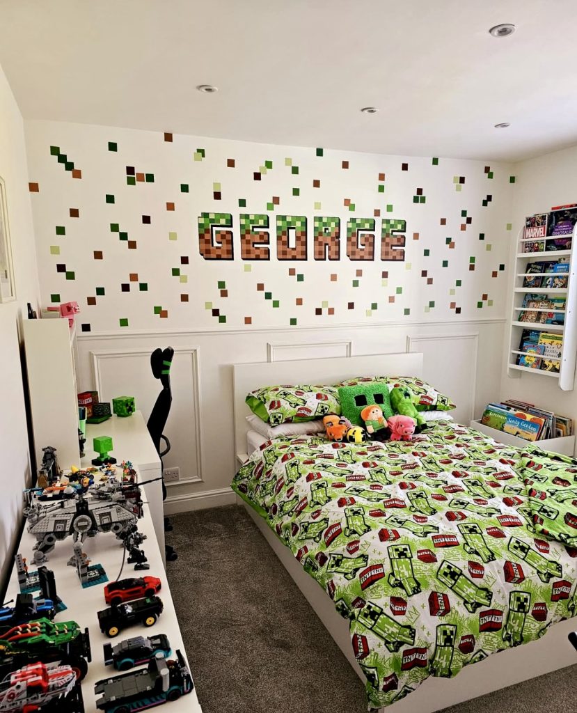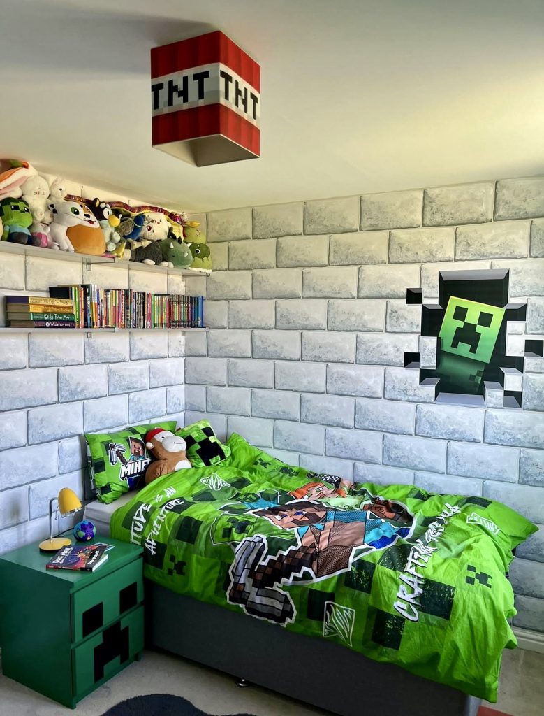 The faux-stone wall treatment is one of the strongest real-life interpretations of a Minecraft environment I’ve seen. It channels the vibe of building a starter base in-game with no mods, relying entirely on simple, tactile materials instead of digital tricks. The Creeper artwork adds personality without overwhelming the design, while the TNT-inspired light fixture brings a bit of playful drama. Paired with bright bedding and a deep green nightstand, the room walks the line between bold and cozy. This is a great blueprint for families who want a visually impactful transformation without leaning into anything too dark or overly intense.