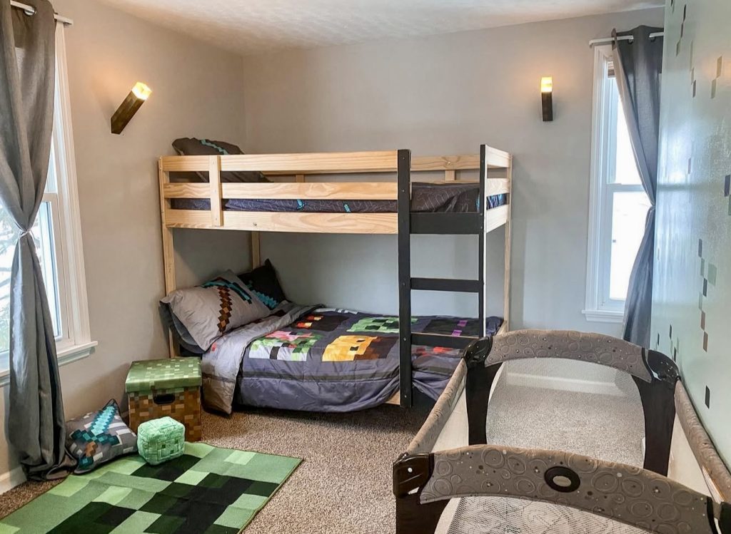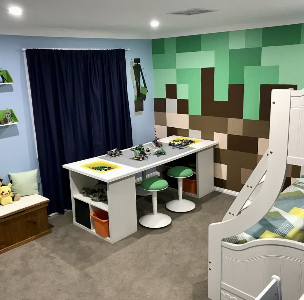 This room leans into the hands-on spirit of Minecraft by giving kids a dedicated crafting table right in their bedroom. The block-pattern feature wall adds an unmistakable game aesthetic, and the bright stools anchor the setup with a burst of color. It captures the excitement of creating something to build both physically and in-game, reinforcing that crossover between digital and real-life play. The layout also reflects advice often shared by Montessori-inspired designers—give kids a visual cue that this is an environment where imagination is encouraged. The result is playful, structured, and wonderfully cozy.