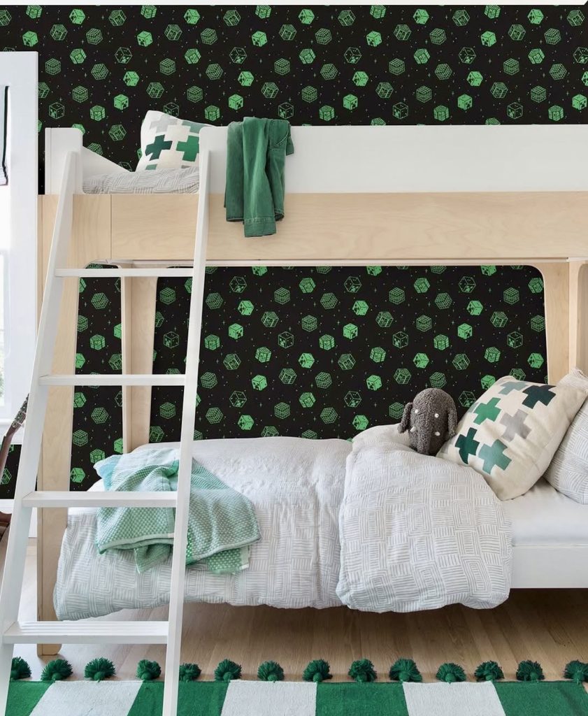 This room introduces a sleek, modern twist by anchoring the space in a striking black backdrop dotted with glowing block patterns. It’s a clever nod to nighttime exploration in the game, where the world feels equal parts mysterious and energizing. The natural wood bunk bed keeps the overall look grounded in real life, preventing the dark palette from becoming too intense. Interior designers like Bobby Berk often talk about contrast as a way to add dimension and personality, and this space is a great example—balancing rich dark tones with fresh greens in a way that still feels playful. The overall mood is both stylish and approachable, ideal for older kids or tweens.