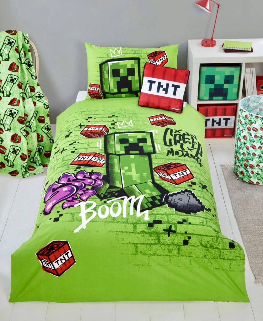 Here, the room centers around vibrant, graffiti-style bedding that blends aesthetic street-art energy with classic game motifs. The bright character graphics, TNT iconography, and bold strokes bring a sense of movement, almost like a lively spawn point in a game. The surrounding furniture stays clean and white, allowing the electric greens and reds to shine—proof that a themed room can stay organized even with high-impact prints. Designers at Target’s Pillowfort collection often highlight how textiles can transform a room more quickly than paint, and this idea nails that concept beautifully. It’s fun, youthful, and an easy way to refresh a Minecraft fan’s room without a full redesign.