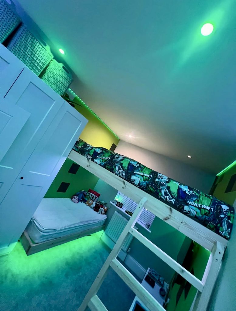 This layout instantly appeals to fans of modern, space-maximizing design. The loft structure creates a natural “upper base,” almost like a survival tower to build in-game, while the lower mattress nook forms a quiet hideaway that even adults would call cozy. The LED lighting—soft green and intentionally diffused—creates a game aesthetic without going overboard, almost like environmental lighting in bedrock worlds. The room feels futuristic but still simple, proving that you don’t need advanced mods or a complex build to create a room with character. For households trying to make shared or smaller rooms feel more playful, this approach is both stylish and functional.