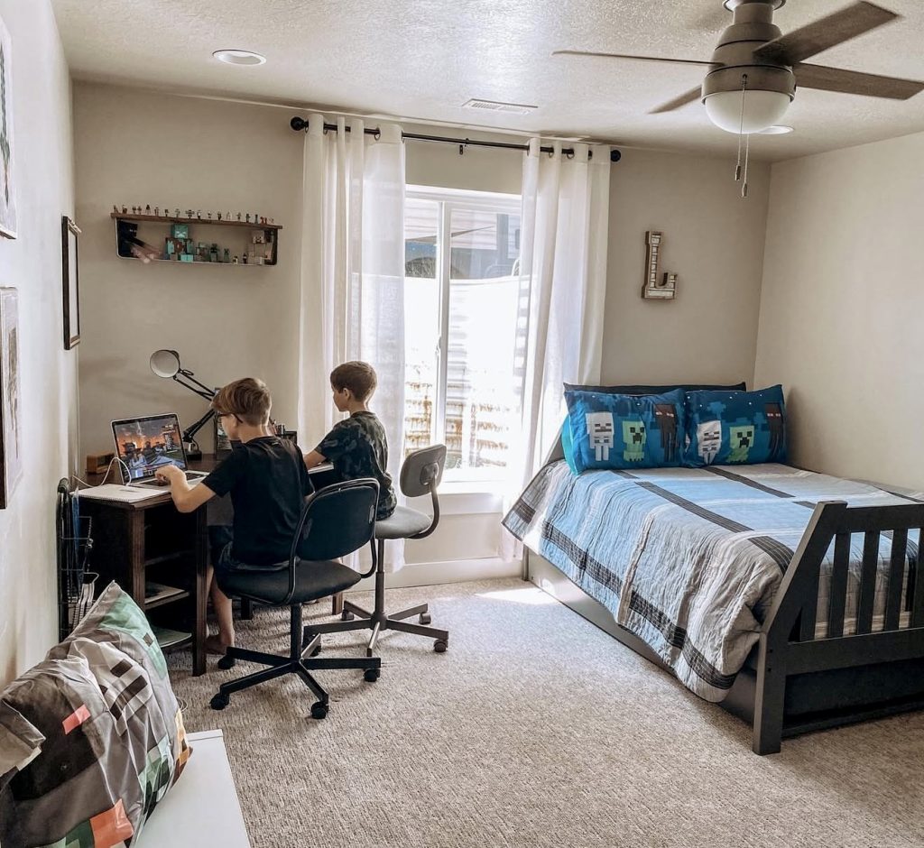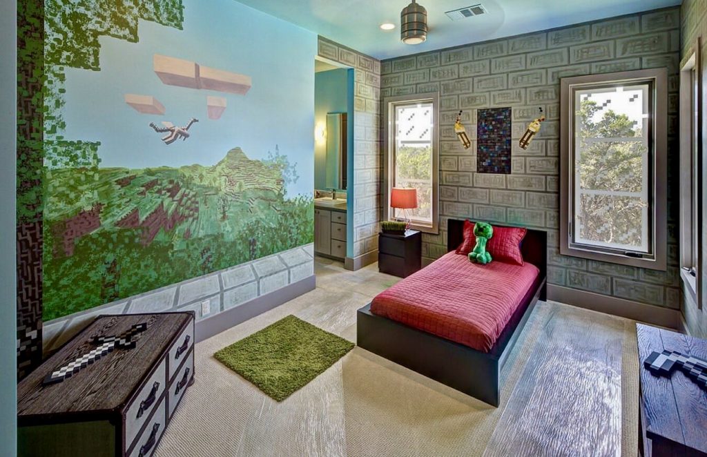 This layout shows how a Minecraft theme can blend seamlessly into a calm, everyday family home. The soft beige walls and natural light create a peaceful environment, while the bedding adds just enough game aesthetic to keep things fun. The workspace is especially relatable—kids teaming up at a desk, playing or building in a game, yet the room still feels tidy and intentionally designed. It’s a great example of what designers at Apartment Therapy often call “quiet theming,” where the décor stays simple, cozy, and real-life friendly without overpowering the space.