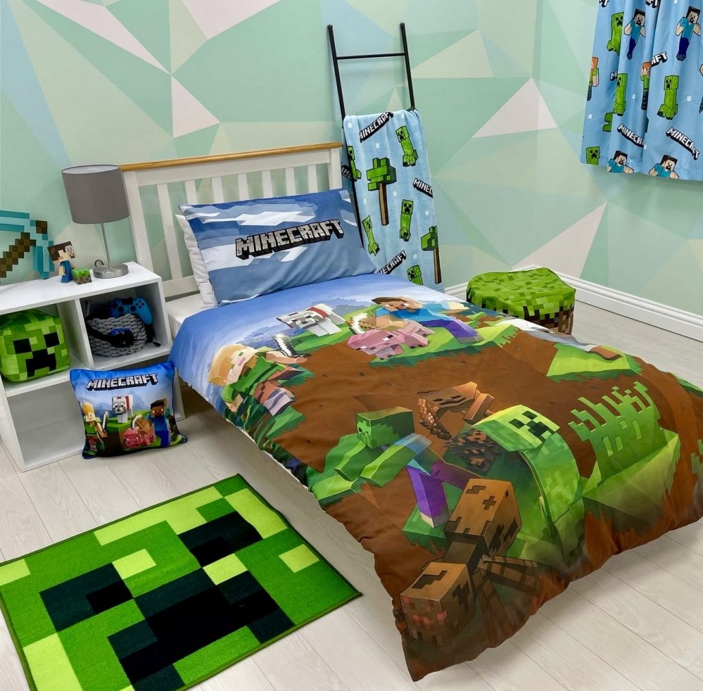 This room takes a fresh, airy approach by pairing Minecraft-themed bedding with modern geometric walls in soft pastels. The palette gives the whole space a gentle, uplifting feel while still leaning into recognizable game visuals. What makes this idea so appealing is how well it blends everyday comfort with playful décor—something lifestyle editors at Good Housekeeping often point to as the key to designing a kid’s room that feels both cozy and visually interesting. The Creeper rug and small block-shaped seat add just enough personality without overwhelming the minimalist layout, giving the room a simple, family-friendly charm that still honors the game aesthetic fans love.