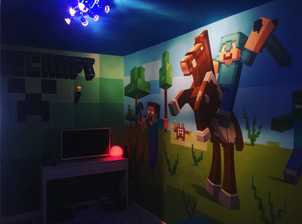 This space delivers full immersion using a bold, dark background paired with vivid character murals that feel like stepping right into a high-stakes adventure in a game. The glowing light fixture gives the entire room a sense of motion and excitement, echoing the dramatic feel of nighttime exploration. It’s a more theatrical interpretation of Minecraft décor—one that older kids and teens often gravitate toward because it feels like a true gaming hub. With its large-scale pixel artwork and focused lighting, the room balances game fantasy with a functional, grounded setup, proving you don’t need elaborate mods to create a memorable experience.