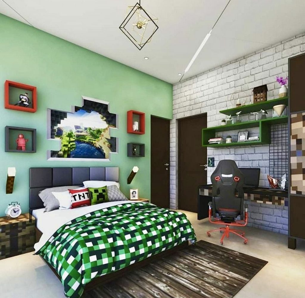 This room leans into a polished, modern interpretation of Minecraft with its clean-lined furniture and sharp color contrasts. The mint-green wall instantly evokes the softness of biomes you’d explore in-game, while the faux “window” cutout serves as a smart illusion that brings a touch of real-life scenery into the space. It mirrors what so many builders try to achieve with panoramic builds in vanilla gameplay—an effortless blend between indoor and outdoor. The floating cube shelves echo pixel blocks without being overly literal, which is a tip often shared by designers at Apartment Therapy when working with themed rooms: lean symbolic, not costume-like. Paired with the deep green bedspread and that understated desk setup, this idea balances playful with practical, proving that Minecraft décor can still feel totally cozy and family-friendly.