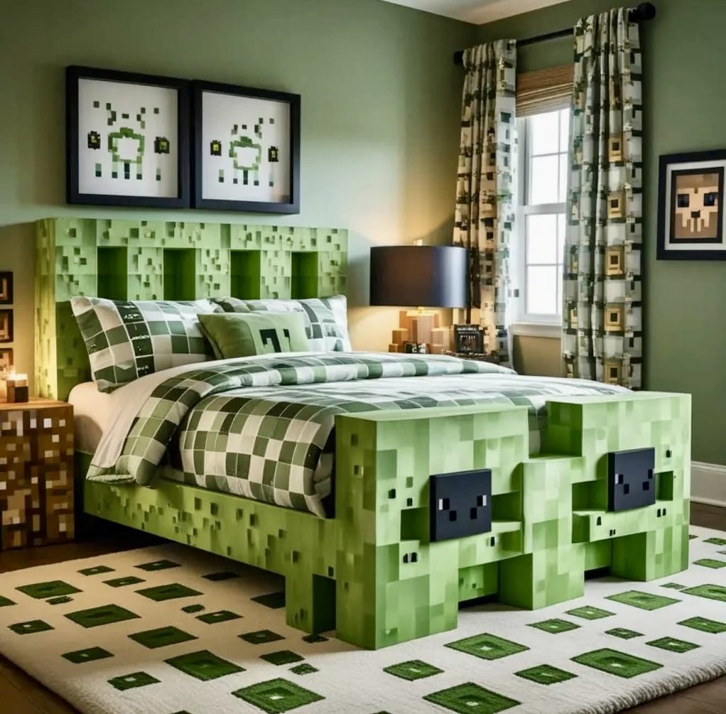 A sculpted Creeper bed is one of those bold choices that looks straight out of a high-end concept shoot. The pixelated structure around the frame feels like an ambitious build a player might attempt to build in Bedrock or a game with no mods, relying on geometry and pattern instead of fancy mods. The green-on-green palette makes the whole room warm and cute, edging into a slightly aesthetic vibe that trendy parents love right now. Even the curtains and rug carry a structured block pattern that ties the space together, almost approaching a game aesthetic cottagecore feel with its soft, repeating textures. It’s the kind of room style you’d expect to see referenced by decor sites like The Spruce when discussing adventurous kids’ room makeovers for 2026.