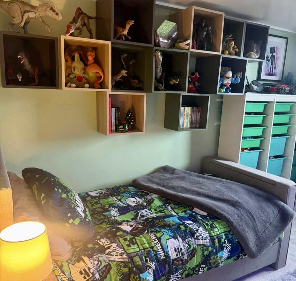 This room does something incredibly smart: it uses modular shelving as a direct nod to Minecraft’s building system. The cubes mimic block placement in the game, making the storage itself part of the theme. What’s lovely here is how simple the concept is—just staggered units in neutral tones—but the execution creates a full game aesthetic without repainting the whole space. The soft green wall color adds calmness, giving the room enough balance so it doesn’t feel visually “loud,” a technique highlighted often by designers like Justina Blakeney when discussing themed rooms that still need to feel livable for adults. With the bold bedding tying everything together, the result is playful, functional, and wonderfully cozy.