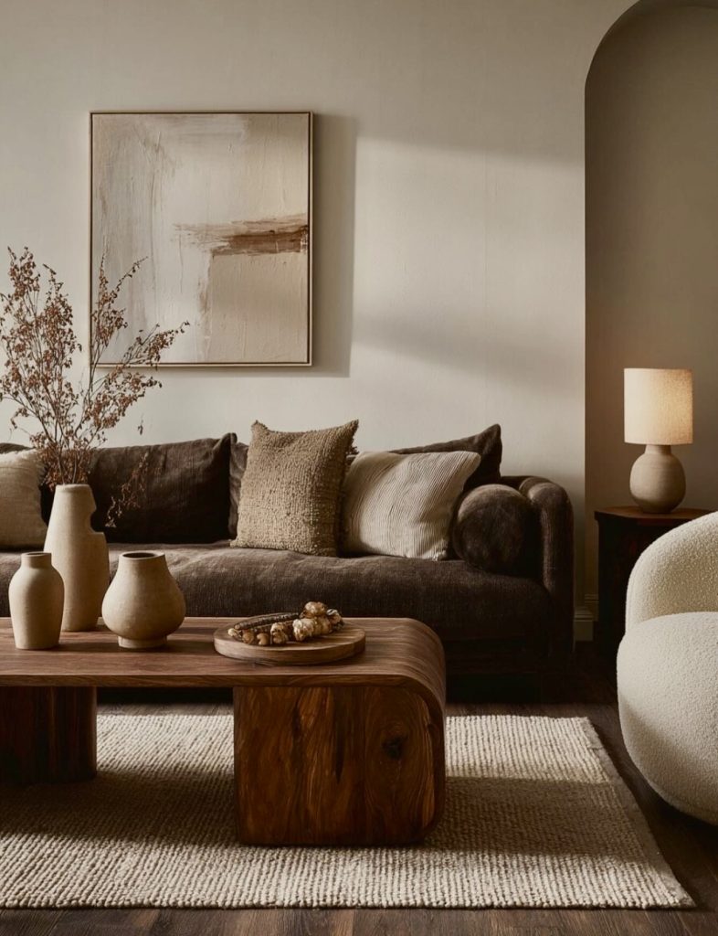 This living room embodies a beautifully earthy minimalism—warm, grounded, and intentionally quiet. The low, sculptural wooden coffee table and handcrafted clay vases add a tactile richness that keeps the room from ever feeling cold, even with its pared-back design. A soft rug and tonal cushions build a naturally cozy atmosphere, showing how restraint can still feel inviting when paired with organic materials. The composition leans toward a modern neutral palette, but there’s also an understated Japanese influence in the clean lines and honoring of natural textures. For anyone seeking inspiration that balances simplicity with soul, this space offers a perfect blueprint.