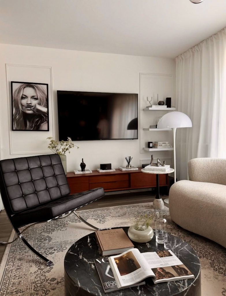 This living room leans into a sleek modern minimalism that feels polished yet lived-in, thanks to its blend of clean lines and soft textures. The black lounge chair introduces a subtle mid-century silhouette, while the marble coffee table and warm wood media console balance the room with organic grounding. Soft drapery diffuses the light, creating a gentle, moody atmosphere that makes the space ideal for quiet evenings or weekend reading sessions. The styling—books, glass vessels, and a touch of greenery—shows how curated decor can maintain simplicity without feeling sparse. This setup reflects the kind of effortless sophistication often praised in contemporary design circles like Architectural Digest, offering inspiration for homeowners who want minimalism with personality.