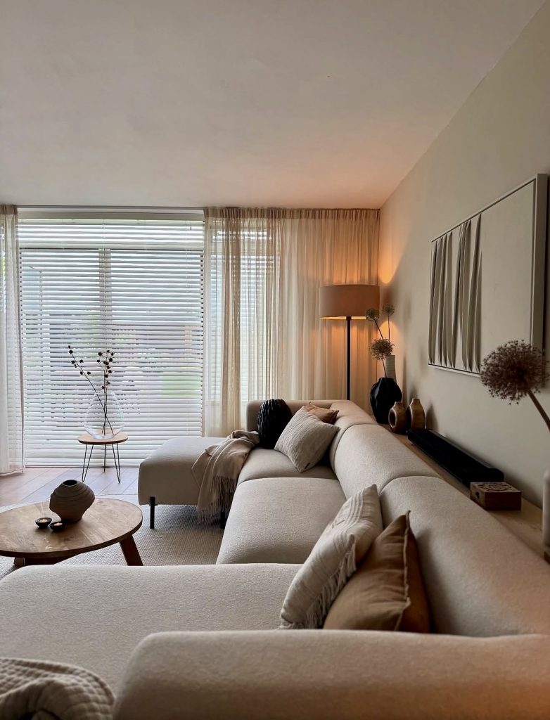 This room has the warm, textural, and calm embrace of Scandinavian minimalism for the comfort of the atmosphere created with a collection of gentle curves and layered fabrics. In range, the color palette remains neutral, only utilizing beige, cream, and sand, to allow soft natural light to flow into the room and brighten the calm. The space is designed with boho influences, though more restrained and intentional than not, using sculptural vases and tactile cushions for inspiration. The elongated sectional embodies a comfort that, along with the clean visual lines, supports a slow-living mindset, a comfort that is very much in demand as 2026 approaches. This space is a perfect example of how restraint in neutral tones and a minimal styling approach are coped with so quietly to not disrupt the idea of a calm and restorative home that so many seek.