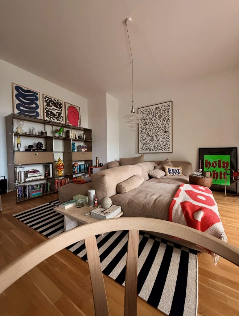 This living room shows how bohemian expression can coexist with minimalist structure, especially when the foundation relies on low-profile furniture and a controlled color palette. The striped rugs introduce bold, graphic energy without overwhelming the room, while the tonal sofa and soft throws maintain grounding. Open shelving becomes an artful display that mixes sculpture, books, and pops of colorful accents, adding vibrancy without chaos. The space feels collected, creative, and a bit rebellious—mirroring the eclectic apartment style celebrated by younger designers and independent studios. It offers fresh ideas for 2026 for anyone wanting to merge minimalism with personal storytelling and visual playfulness.