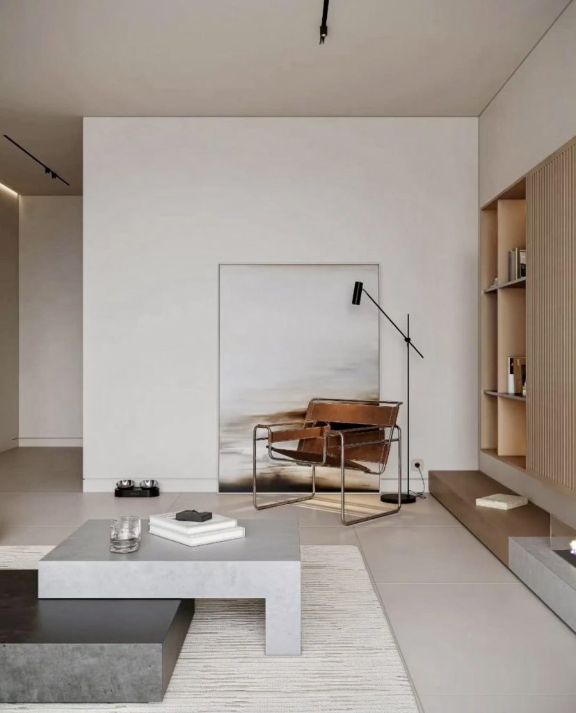 Here, minimalism is pushed into its purest contemporary form, relying on crisp lines, architectural restraint, and tonal cohesion to define the room. Every detail—from the geometric coffee table to the sculptural leather chair—reflects a commitment to refined simplicity. The open negative space is intentional, not empty, giving the room a gallery-like quality often associated with modern Japanese-inspired interiors. Soft textures underfoot and subtle built-in shelving ensure the environment remains cozy rather than cold, providing a balanced study in reduction. Homeowners looking for elevated, art-forward design inspiration will find this space a compelling blueprint.