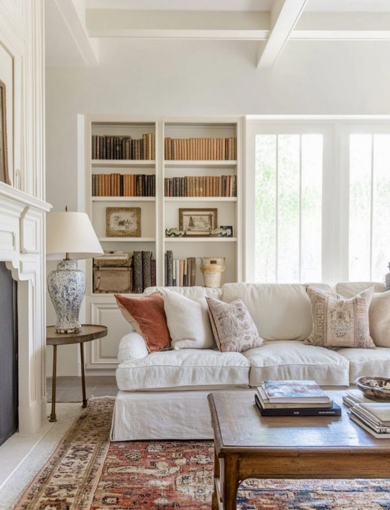 This blends the charm of tradition with a minimalist mindset, proving clean design doesn’t need to ignore heritage. The linen sofa, vintage rug, and books all over the place create a tactile, earthy environment that is welcoming, grounded, and beautifully harmonious. The subdued soft whites and browns keep the area organized, and the design of the furniture exemplifies a modern look. The historical artwork, decoration, and subtle details provide depth and are a great reference of organized minimalism with a certain warmth and timeless character to vintage pieces. The pieces themselves bolster the timeless character of the design. Ideas for 2026 are also about vintage pieces that tell a story.