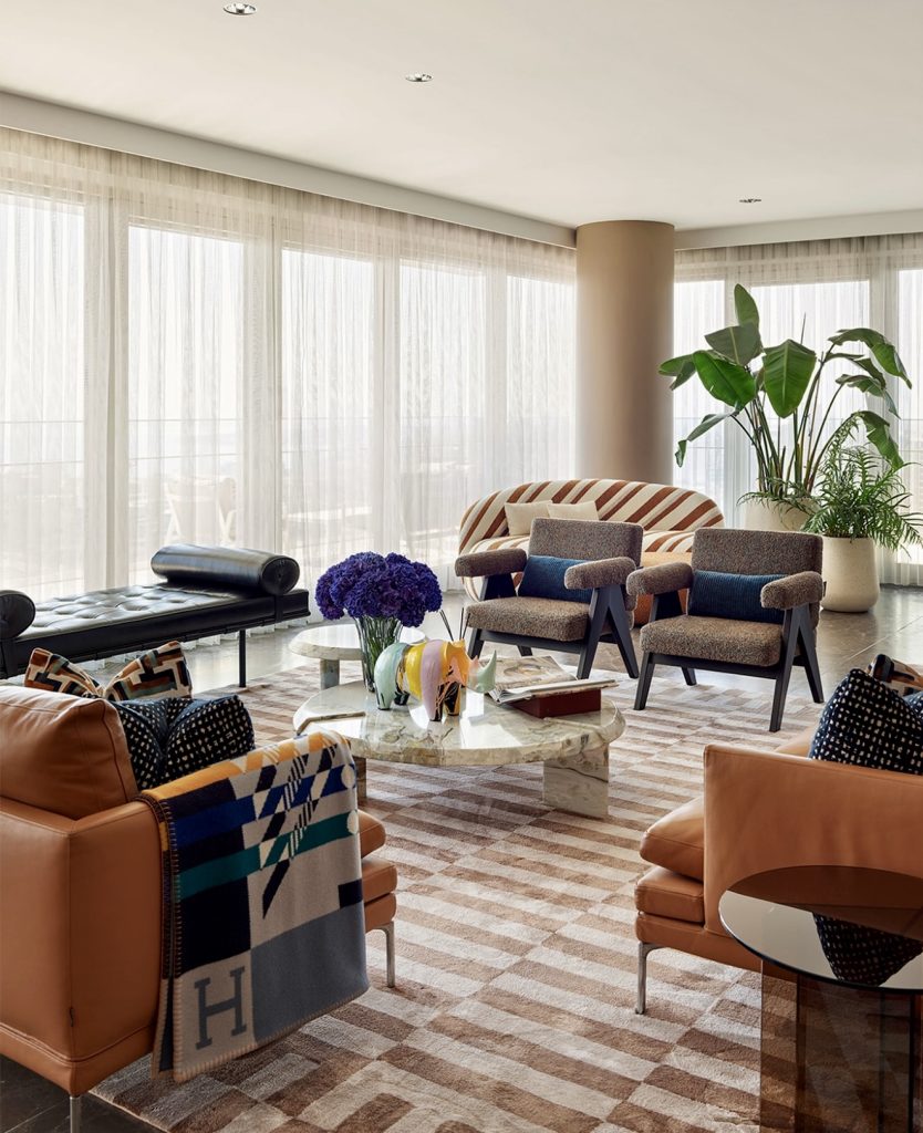 This vibrant, high-rise living room shows how a minimalist foundation can still embrace colorful energy and personality. While the structural choices—clean-lined sofas, marble tables, and tonal rugs—stay true to modern minimalism, the expressive textiles and bold seating inject a dynamic rhythm into the space. Strategic placement of oversized plants and layered seating helps soften the openness created by the floor-to-ceiling windows, giving it a cozy undertone despite its expansive scale. The combination of refined materials and lively accents mirrors the direction many designers are predicting for ideas in 2026, where minimalism becomes less strict and more emotionally resonant. It’s proof that simplicity can coexist beautifully with playful visual storytelling.