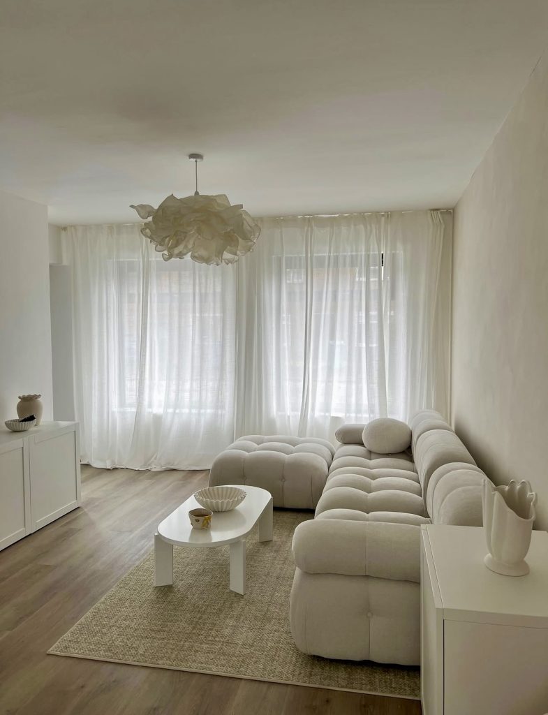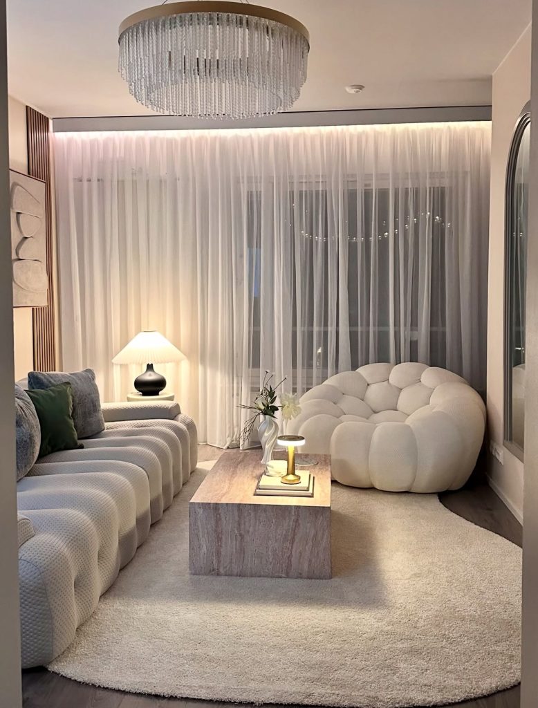 This space is a masterclass in soft, sculptural minimalism. The curved sofa and plush accent chair bring a distinctly Scandinavian feeling—calm, tactile, and inviting—while the layered drapery introduces movement without adding visual noise. A quiet white palette dominates the room, supported by subtle stone textures that elevate the design without overwhelming it. The overall effect is incredibly cozy, offering ideas for 2026 for anyone who prefers a gentle, cloud-like atmosphere in their living room. The room’s organic shapes and soft lighting create an oasis perfect for unwinding after a long day.