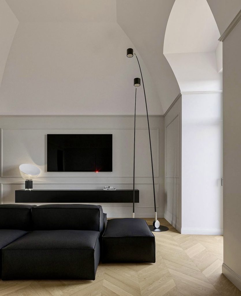 This space delivers a striking, moody minimalist aesthetic, defined by architectural arches, dramatic lighting, and bold contrast. The deep black sectional becomes a sculptural anchor against the pale walls, creating visual tension that feels both refined and modern. Clean lines dominate the space, from the elongated floating console to the slender floor lamp, showcasing a disciplined approach to design that avoids excess while still feeling luxurious. The herringbone flooring adds an understated earthy warmth, preventing the room from feeling too stark. This environment captures the sophistication often highlighted by European editorial designers and provides inspiration for homeowners wanting minimalism with depth and expressive architectural character.