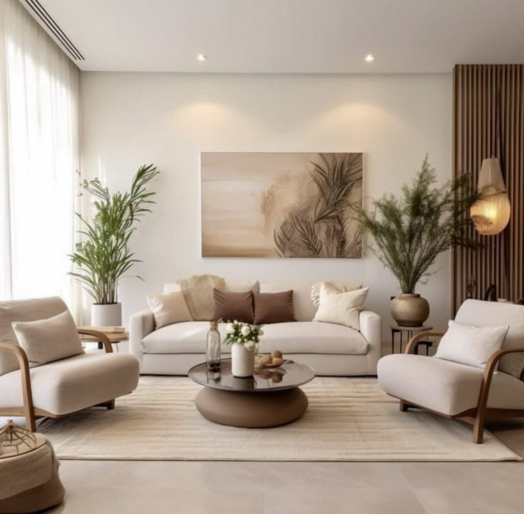 This bright, airy living space takes a contemporary approach to minimalist decorating, using layered neutrals and rounded furniture to create an uplifting yet calm environment. The palette stays grounded in white, sand, and soft browns, making the greenery feel refreshingly colorful without overpowering the room. The arrangement is ideal for a smaller home or apartment, offering smart ideas for people who want their space to feel open without sacrificing comfort. Subtle decor choices, like textured cushions and a smooth circular coffee table, keep the aesthetic clean but far from plain. It’s a gentle reminder that minimalism can be both serene and full of personality.