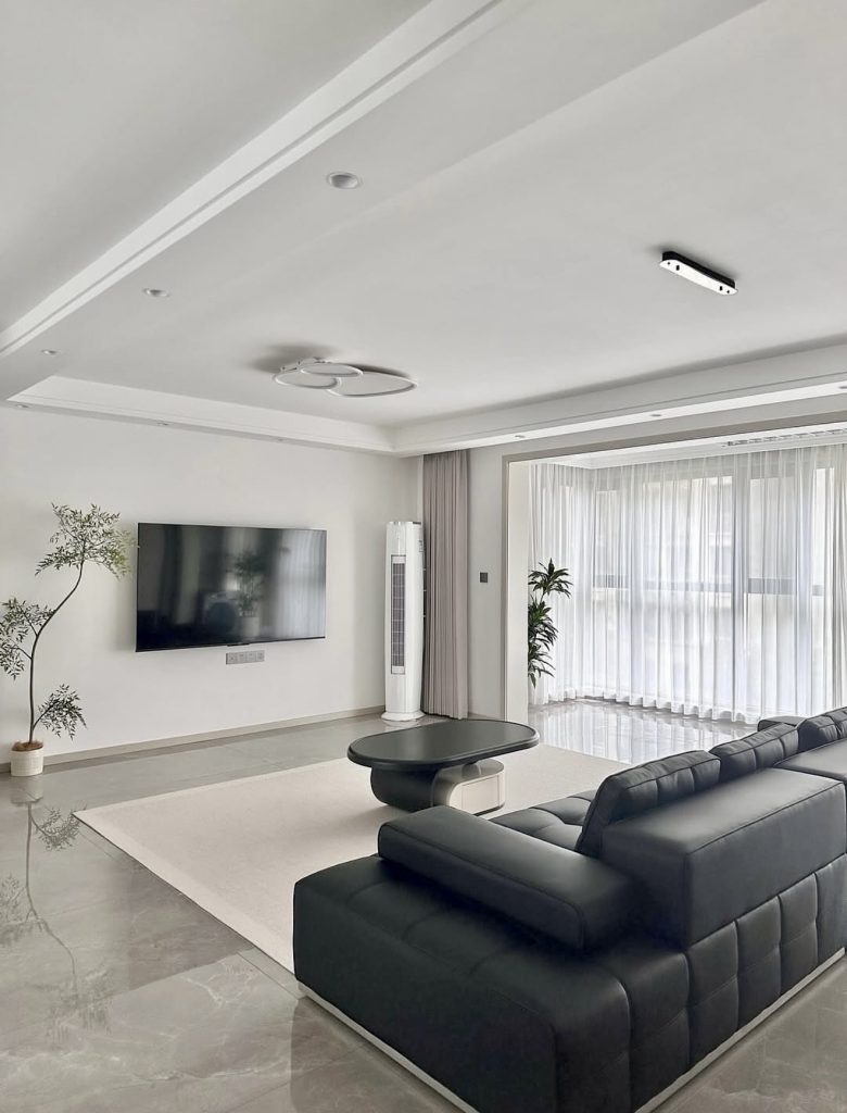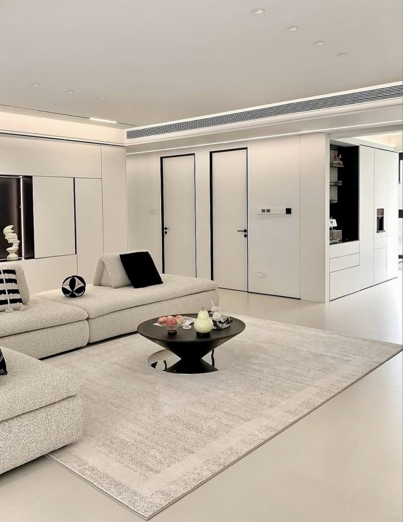 This clean, expansive living room is a study in airy contemporary design, where sharp lines and high-contrast accents bring structure to an otherwise serene environment. The plush modular sofa provides comfort without compromising the minimalist aesthetic, and the oversized textured rug adds softness underfoot. Subtle black detailing—from pillows to door trims—introduces visual definition while staying aligned with the room’s modern restraint. Bright natural light strengthens the sense of openness, enhancing the subtle white and grey palette that makes this space so calming. It’s a fresh example of how minimalism in 2026 prioritizes clarity and balance over starkness.