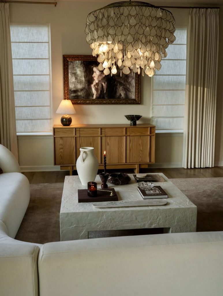 This elegant space captures a beautifully moody interpretation of minimalism, where soft lighting and rich textures replace the need for bold décor. The sculptural chandelier adds a sense of theatrical romance, while the oversized stone coffee table brings a grounding, earthy weight to the room. Warm wood tones from the cabinet and the expressive framed portrait infuse the space with quiet emotional depth. Rather than relying on clutter, the room uses a handful of well-chosen pieces—a tall ceramic vase, a single candle—to create a curated ambiance that feels intentionally sparse yet deeply cozy. It’s the kind of intimate setting often highlighted by boutique design studios focusing on slow, soulful living.