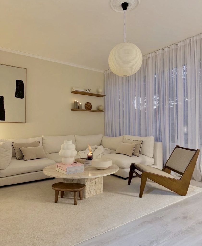 This living room demonstrates how neutral palettes can feel anything but flat when layered thoughtfully through textiles, shapes, and warm lighting. The sectional sofa creates a welcoming, cozy foundation, while the round travertine coffee table and sculptural ceramics add subtle tactile interest. Floating shelves offer a soft backdrop for minimalist decor, keeping the room visually calm while still personal. The oversized paper pendant nods to Japanese influences in contemporary interiors, bringing a light, serene presence that balances the more structured furniture below. As a whole, this room is a gentle, stylish example of the 2026 movement’s ideas toward approachable, lived-in minimalism.