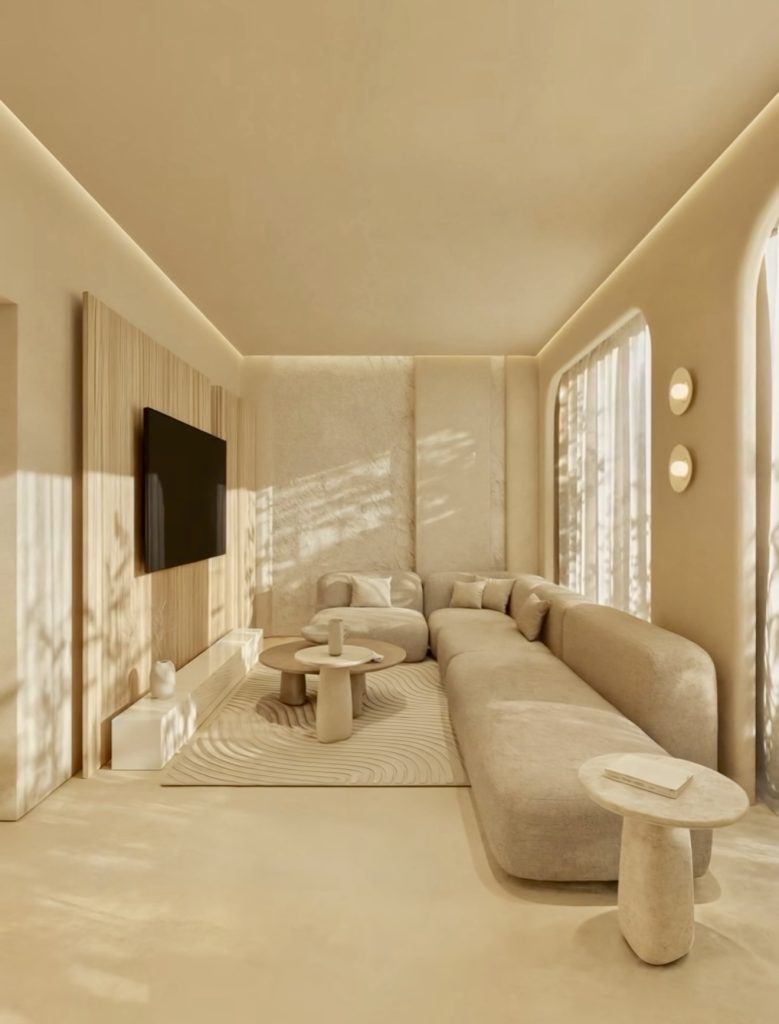 This monochromatic oasis embodies a soft, sculptural approach to modern minimalism—one that relies on form, shadow, and texture instead of decorative excess. Curved seating, ribbed wall panels, and rounded tables create a harmonious landscape of organic silhouettes. The monochrome palette lends the space a serene stillness, highlighted by the natural light drifting across its surfaces. Even with its ultra-minimal look, the room maintains a distinctly cozy atmosphere through layered fabrics and gentle architectural lighting. This is minimalism at its most meditative, offering calming inspiration for anyone seeking a retreat-like living space that supports slow living.