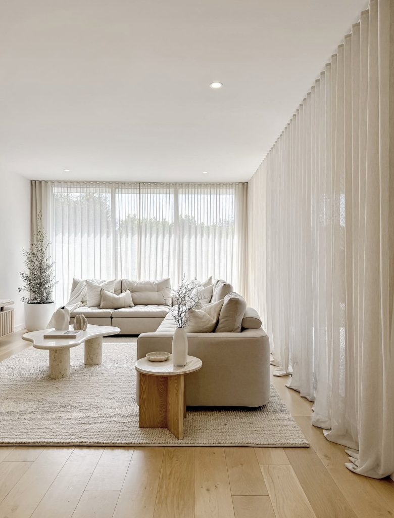 This living room embodies the lightness and calm that define modern neutral spaces in 2026. Floor-to-ceiling sheers wash the room in soft daylight, creating a sense of openness that feels restorative and deeply cozy. The creamy palette, rounded seating, and textured rug work together to build a layered serenity without relying on ornamentation. Sculptural ceramic pieces bring subtle earthy contrast, while the pale wood flooring adds warmth and balance. The entire space shows how minimalism can enhance a home’s emotional comfort—an approach that resonates strongly with U.S. homeowners seeking clarity, calm, and gentle visual order in their everyday environment.
